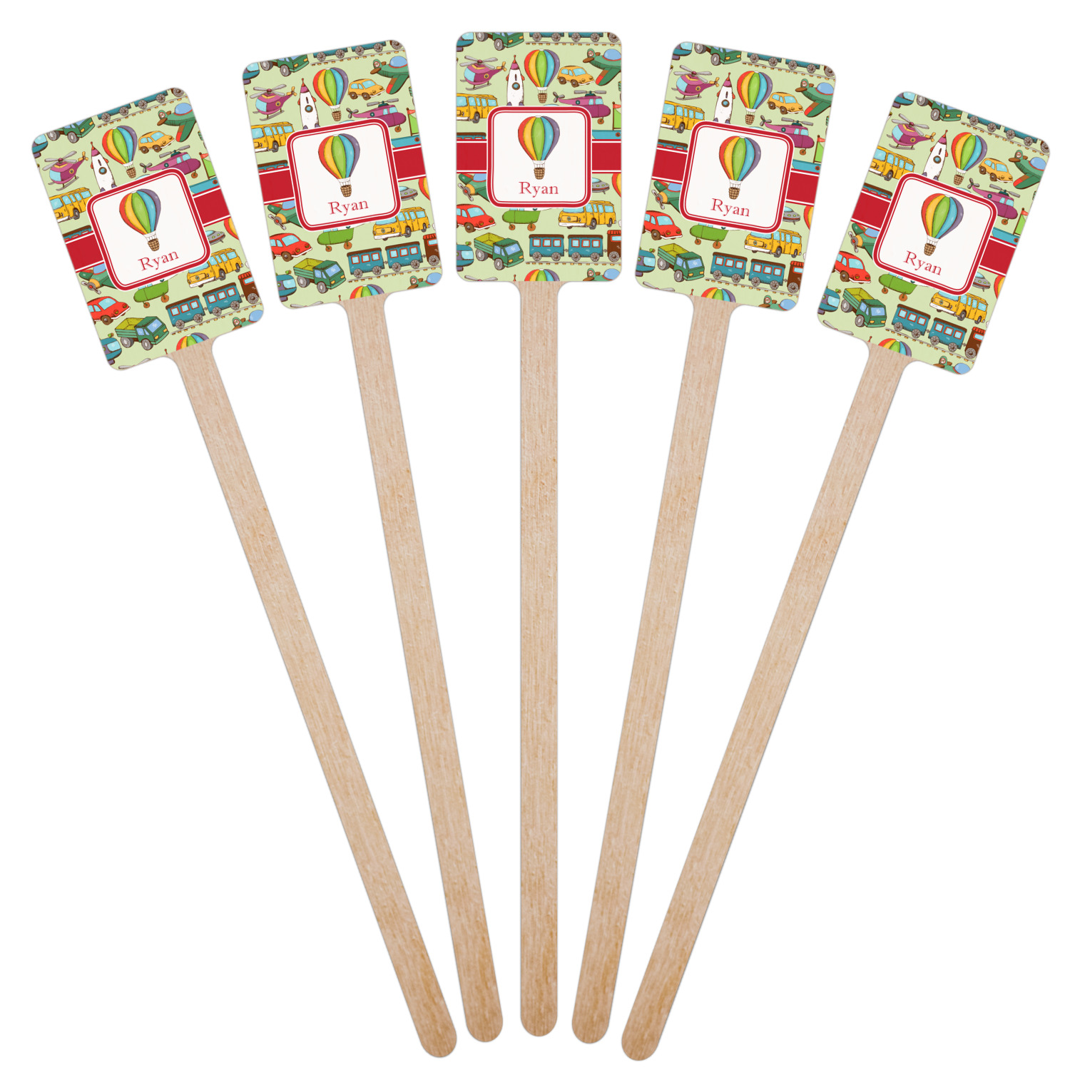 We have featured the various forms of transportation on a soft green background, with a classic red ribbon and square label. The label features a vintage hot air, along with a name for personalization.