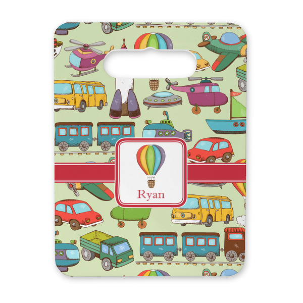 We have featured the various forms of transportation on a soft green background, with a classic red ribbon and square label. The label features a vintage hot air, along with a name for personalization.