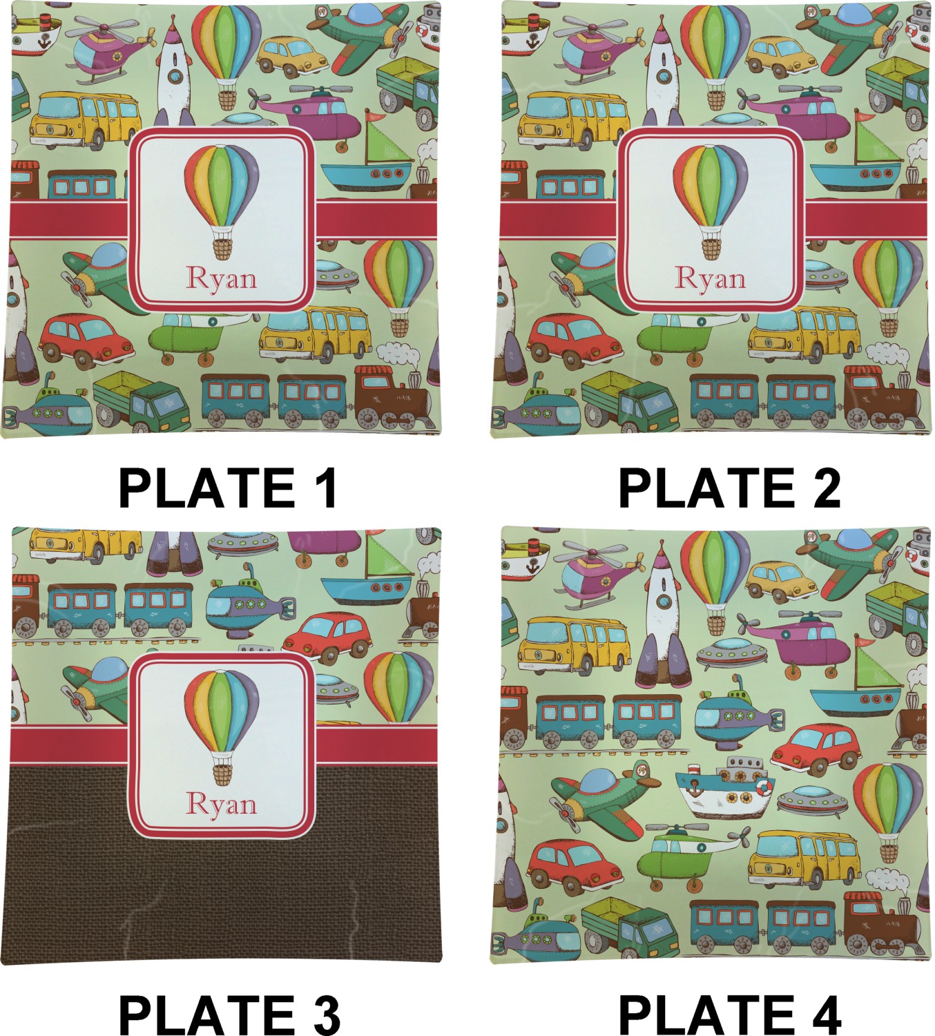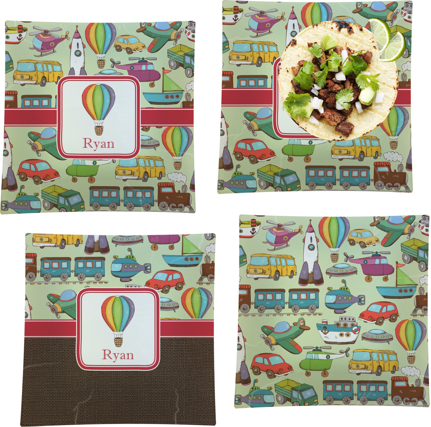 We have featured the various forms of transportation on a soft green background, with a classic red ribbon and square label. The label features a vintage hot air, along with a name for personalization.