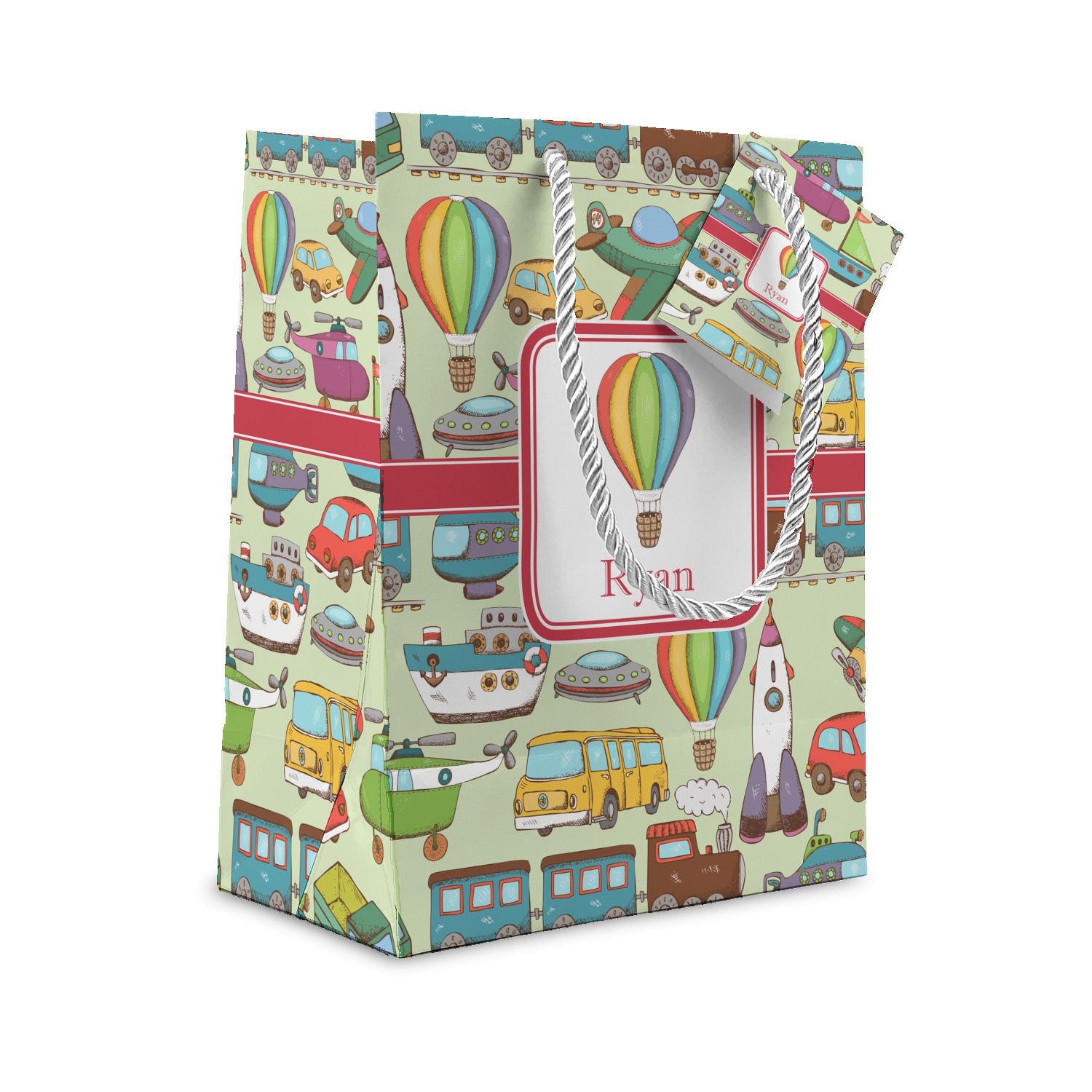 We have featured the various forms of transportation on a soft green background, with a classic red ribbon and square label. The label features a vintage hot air, along with a name for personalization.