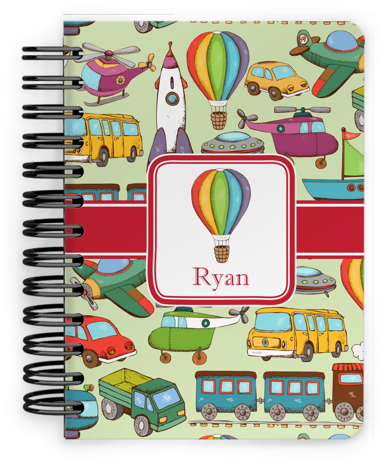 We have featured the various forms of transportation on a soft green background, with a classic red ribbon and square label. The label features a vintage hot air, along with a name for personalization.