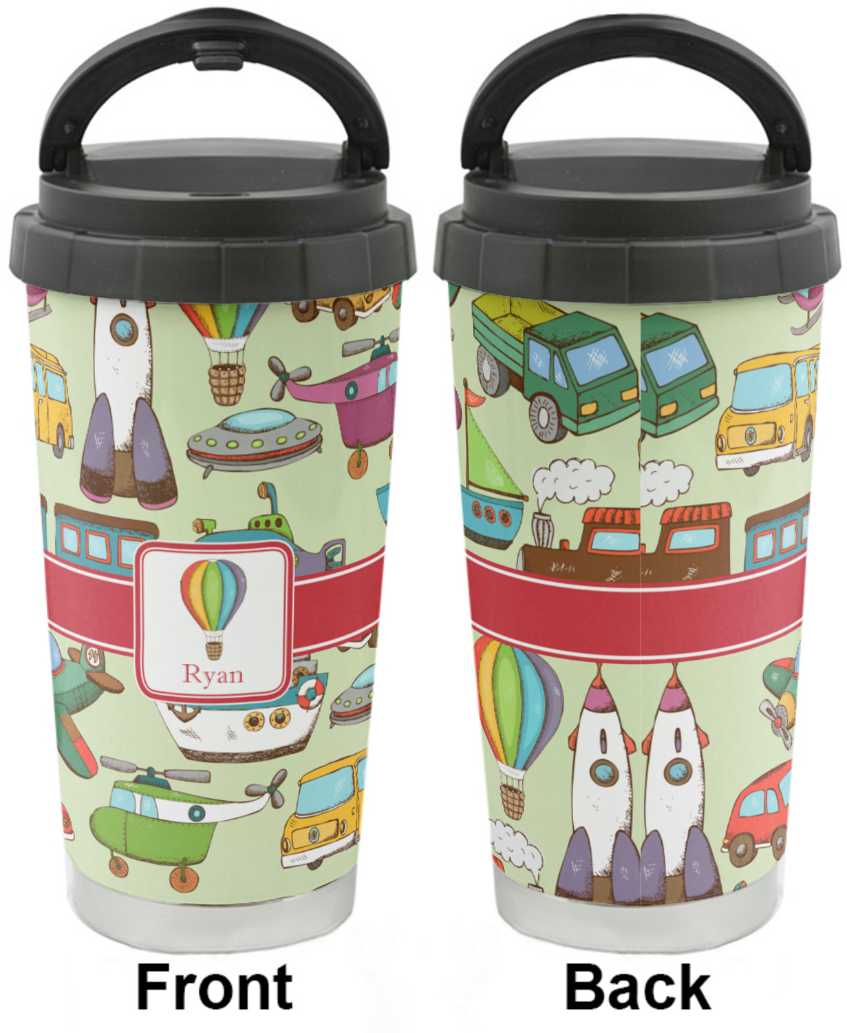 We have featured the various forms of transportation on a soft green background, with a classic red ribbon and square label. The label features a vintage hot air, along with a name for personalization.