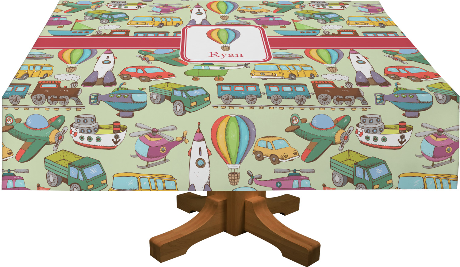 We have featured the various forms of transportation on a soft green background, with a classic red ribbon and square label. The label features a vintage hot air, along with a name for personalization.