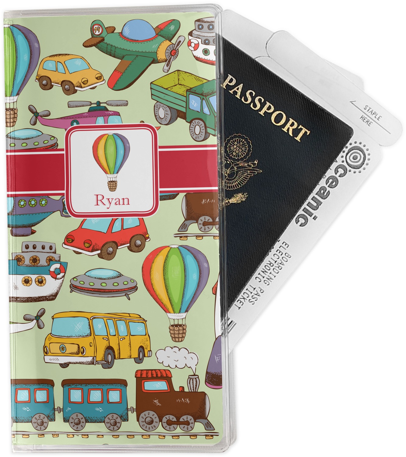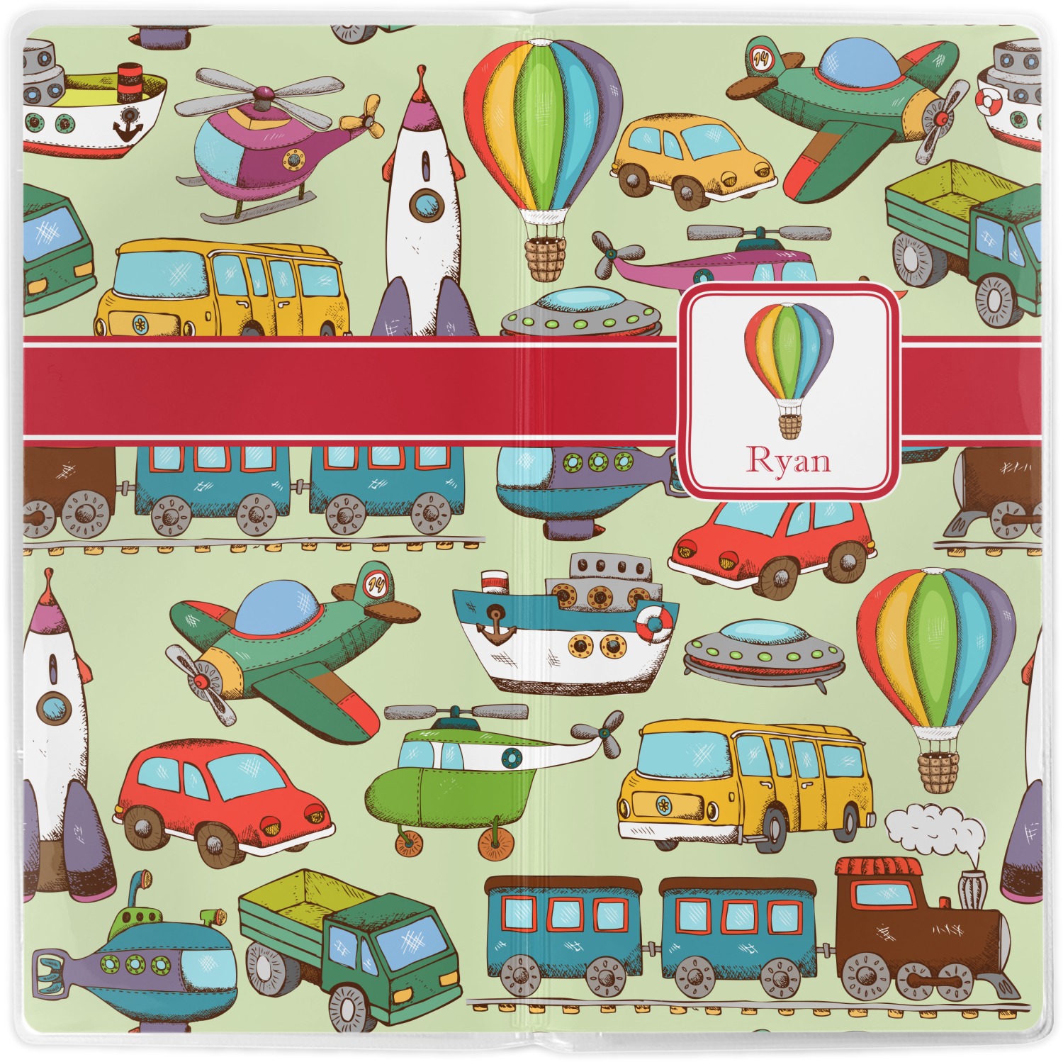 We have featured the various forms of transportation on a soft green background, with a classic red ribbon and square label. The label features a vintage hot air, along with a name for personalization.