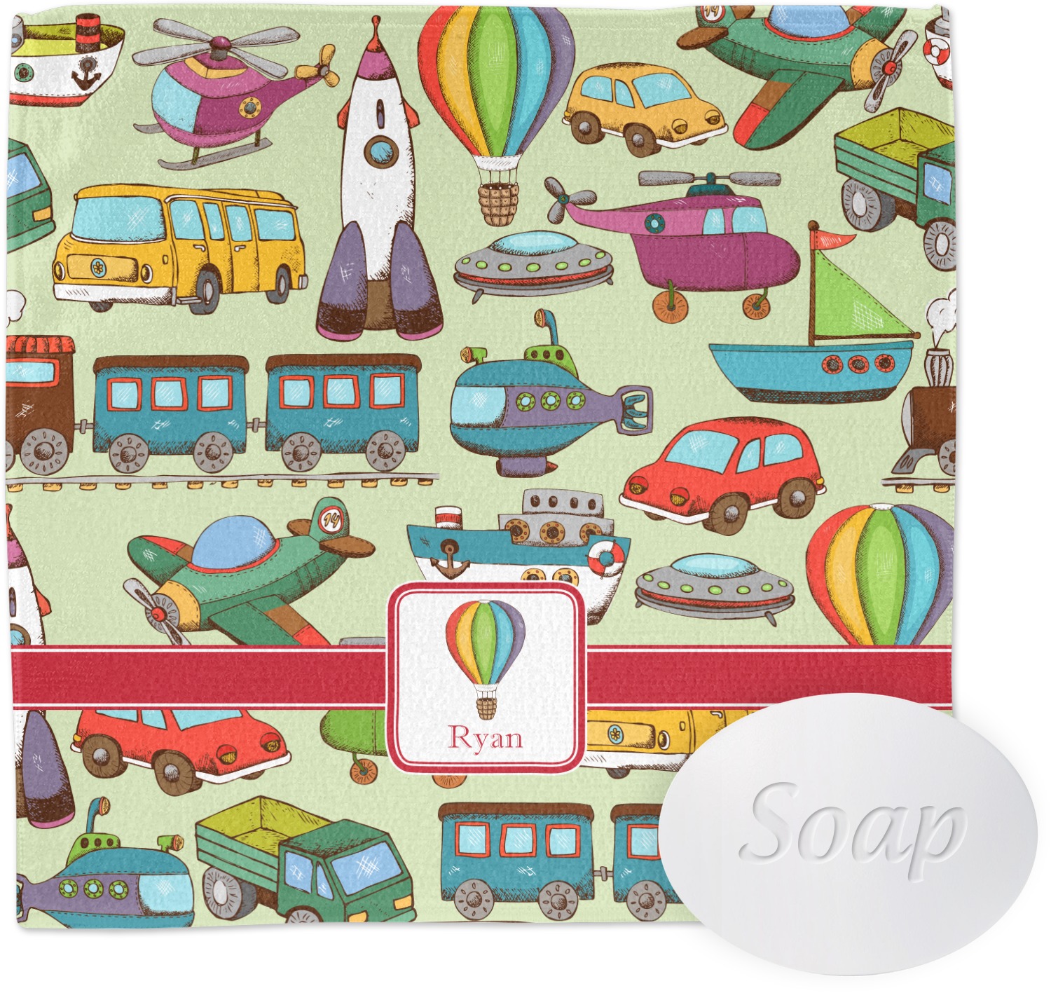 We have featured the various forms of transportation on a soft green background, with a classic red ribbon and square label. The label features a vintage hot air, along with a name for personalization.