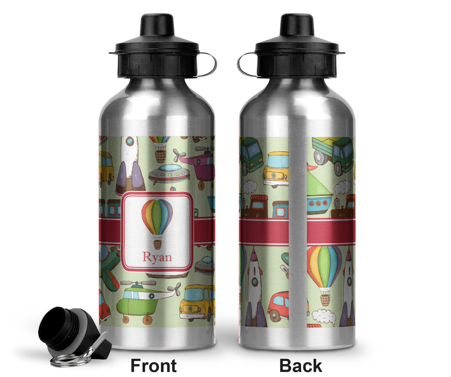 We have featured the various forms of transportation on a soft green background, with a classic red ribbon and square label. The label features a vintage hot air, along with a name for personalization.