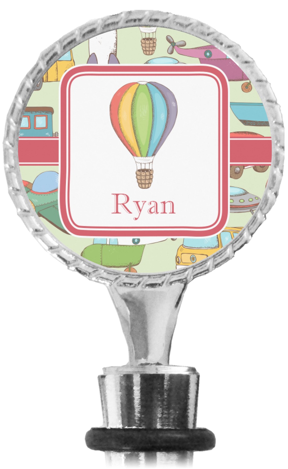 We have featured the various forms of transportation on a soft green background, with a classic red ribbon and square label. The label features a vintage hot air, along with a name for personalization.