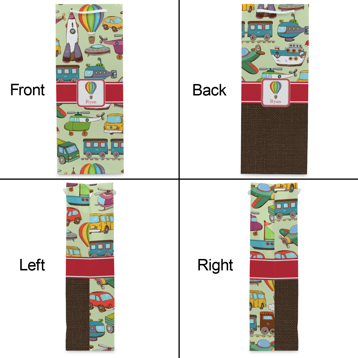 We have featured the various forms of transportation on a soft green background, with a classic red ribbon and square label. The label features a vintage hot air, along with a name for personalization.