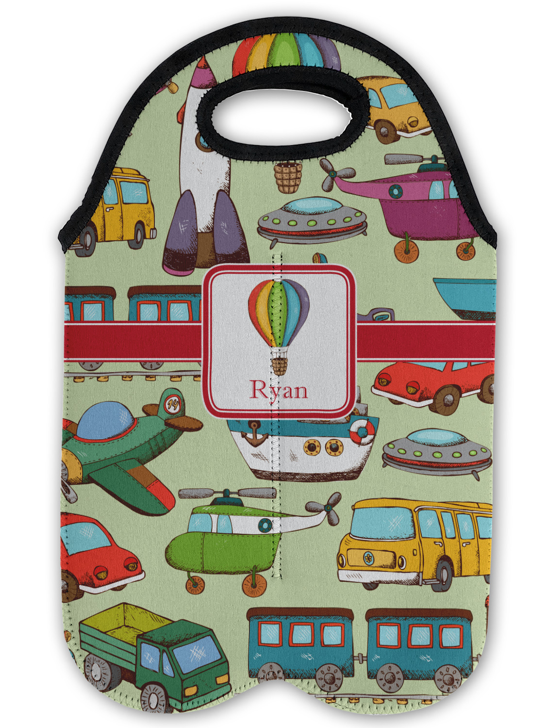 We have featured the various forms of transportation on a soft green background, with a classic red ribbon and square label. The label features a vintage hot air, along with a name for personalization.