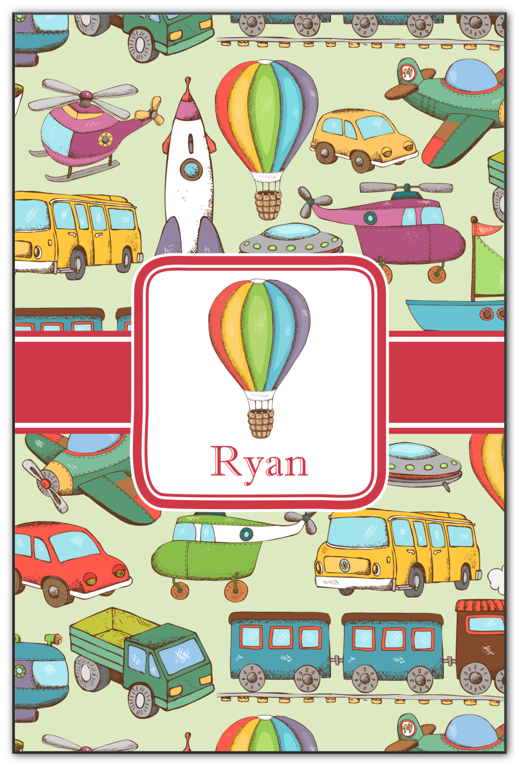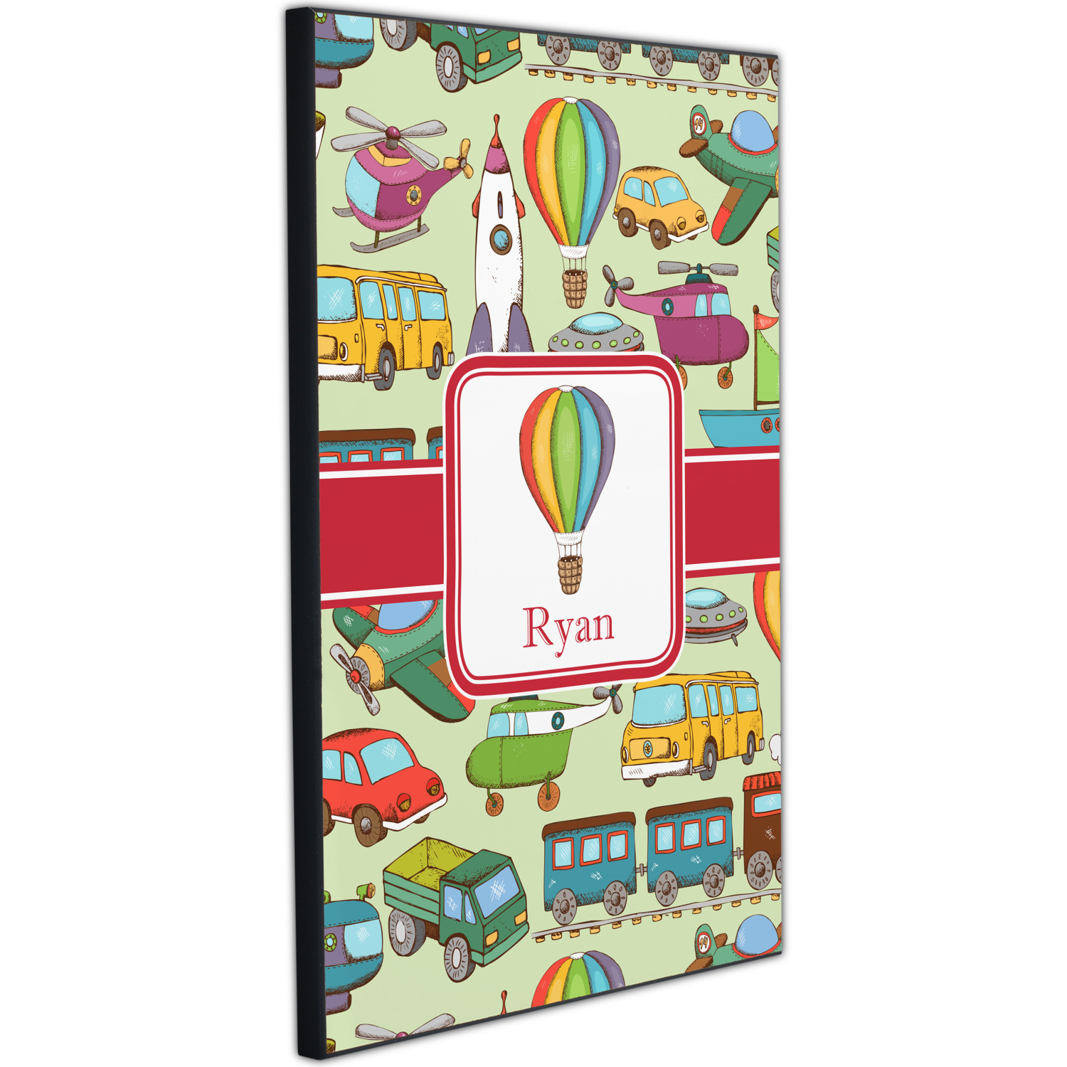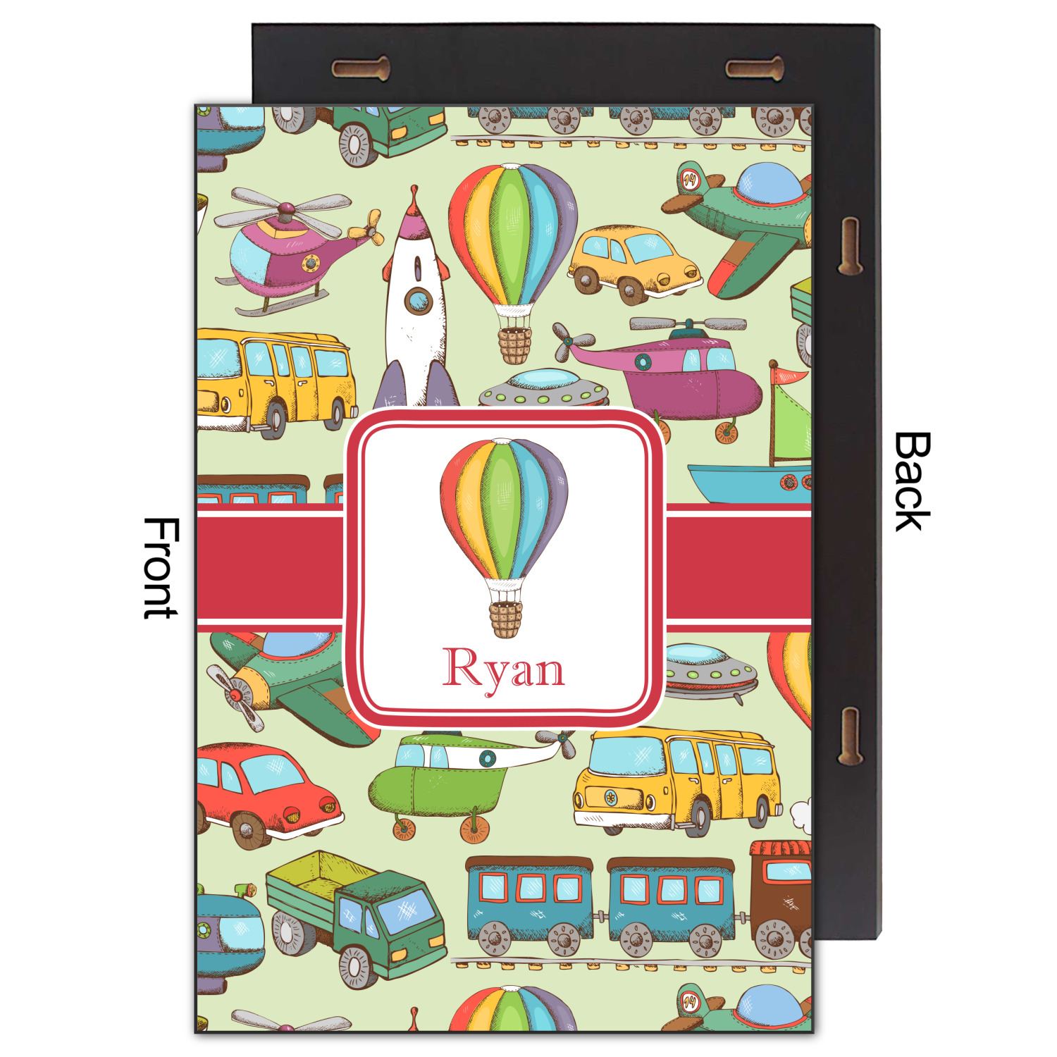 We have featured the various forms of transportation on a soft green background, with a classic red ribbon and square label. The label features a vintage hot air, along with a name for personalization.