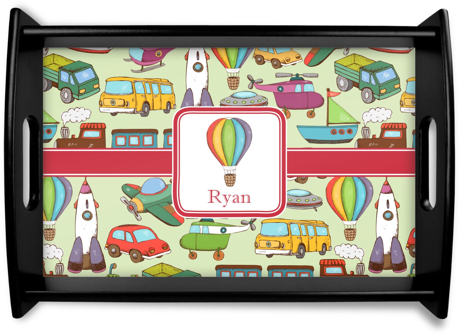 We have featured the various forms of transportation on a soft green background, with a classic red ribbon and square label. The label features a vintage hot air, along with a name for personalization.