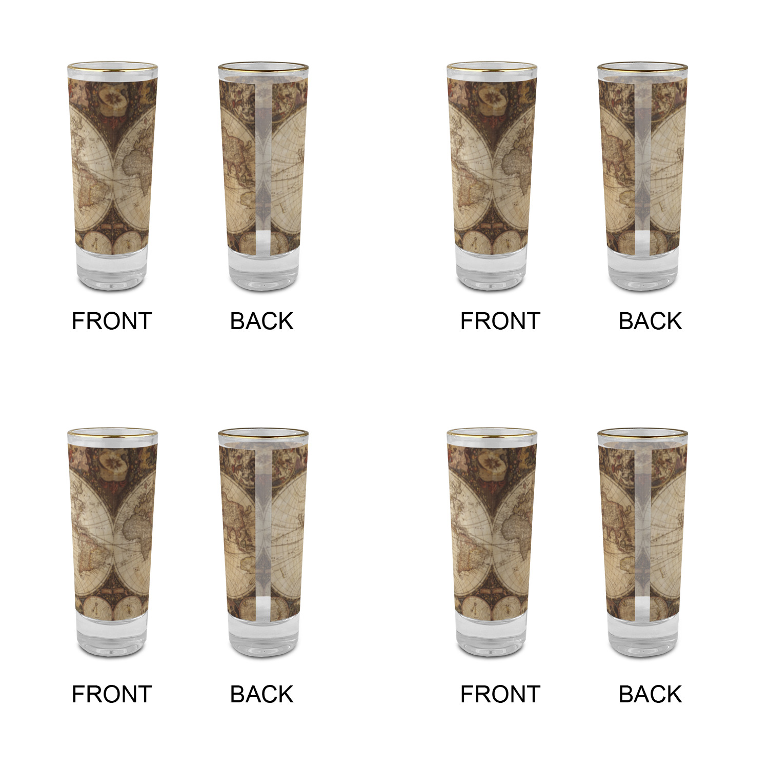 These glass shooter glasses are printed in full color with the design of your choice. These are a tall shooter 2 oz size and stand 4" tall. The print is a full wrap design to boldly display your personalization.