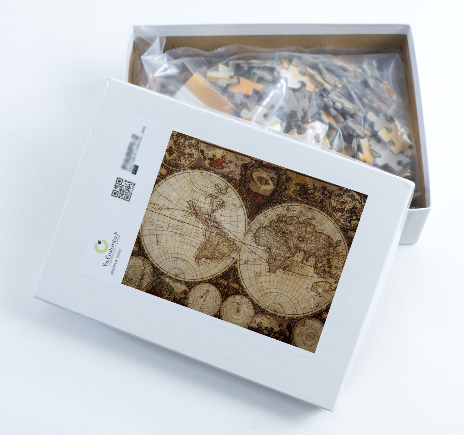 We print our puzzles on thick white chipboard in vibrant colors, then laminate the chipboard and die cut your puzzle. Your jigsaw puzzle is shipped to you in a box with the image of the puzzle on the box.