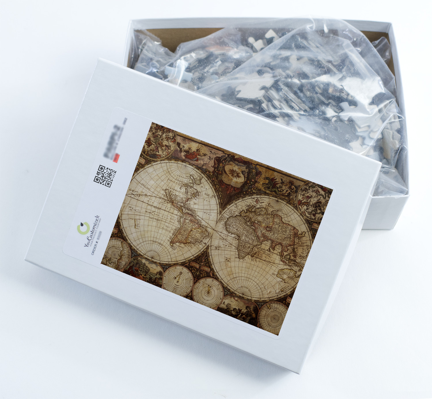 We print our puzzles on thick white chipboard in vibrant colors, then laminate the chipboard and die cut your puzzle. Your jigsaw puzzle is shipped to you in a box with the image of the puzzle on the box.
