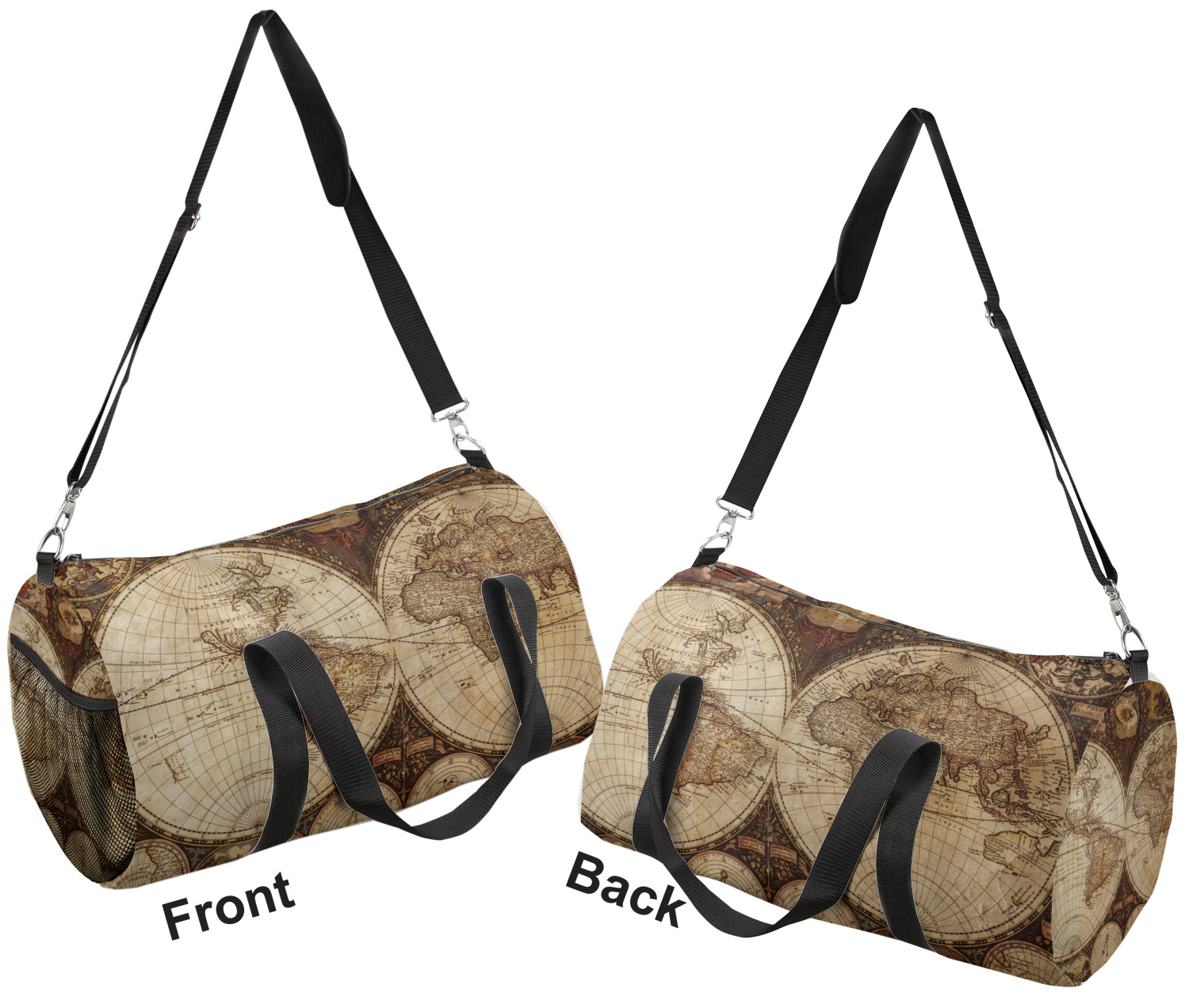 This duffle is a sturdy bag made of a canvas material. It comes in two sizes: Small (19"W x 9.5"H x 9.5"D) and Large (23"W x 12"H x 12"D). The bag is a cylindrical shape with a black adjustable strap and two handles. On one side is an elastic pouch to put a waterbottle or other small item. Your product will be sublimated with your design and is able to be designed on the front, back, and sides. Be sure to remember that the straps may cut into parts of your design if you upload your own artwork.