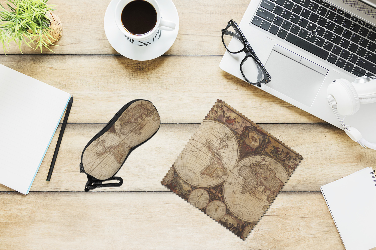 The cases have the design on both sides, a black zipper, and clips for hanging on a belt buckle or purse strap and also include matching lens cloths.