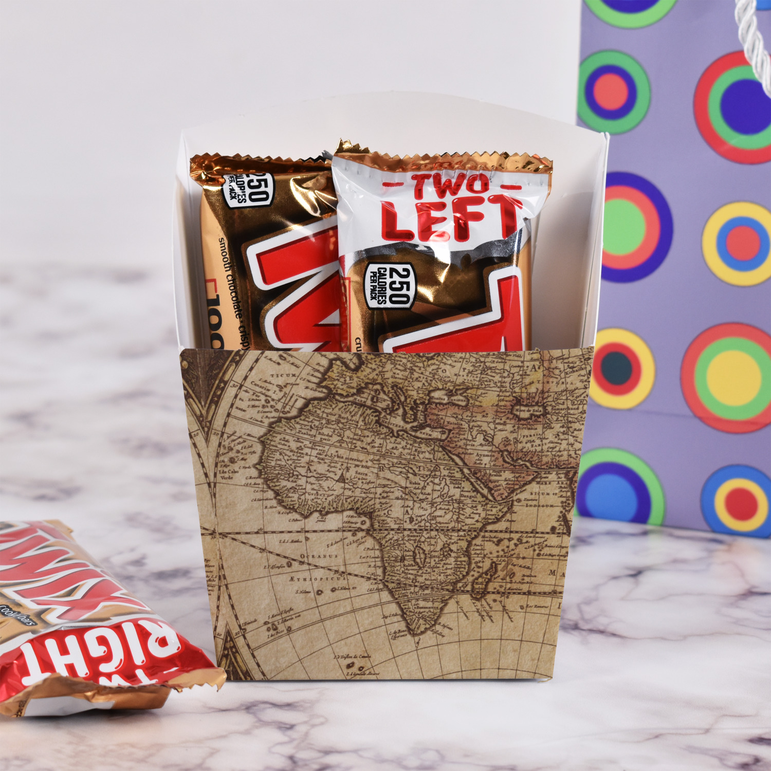 These french fry favor boxes are a pretty good size i.e. 5.25" tall x 4.25" wide x 1..625" deep. If you are not good with dimensions - it easily fits 2 full size Twix bars, or it is the size of McDonald's large fries.