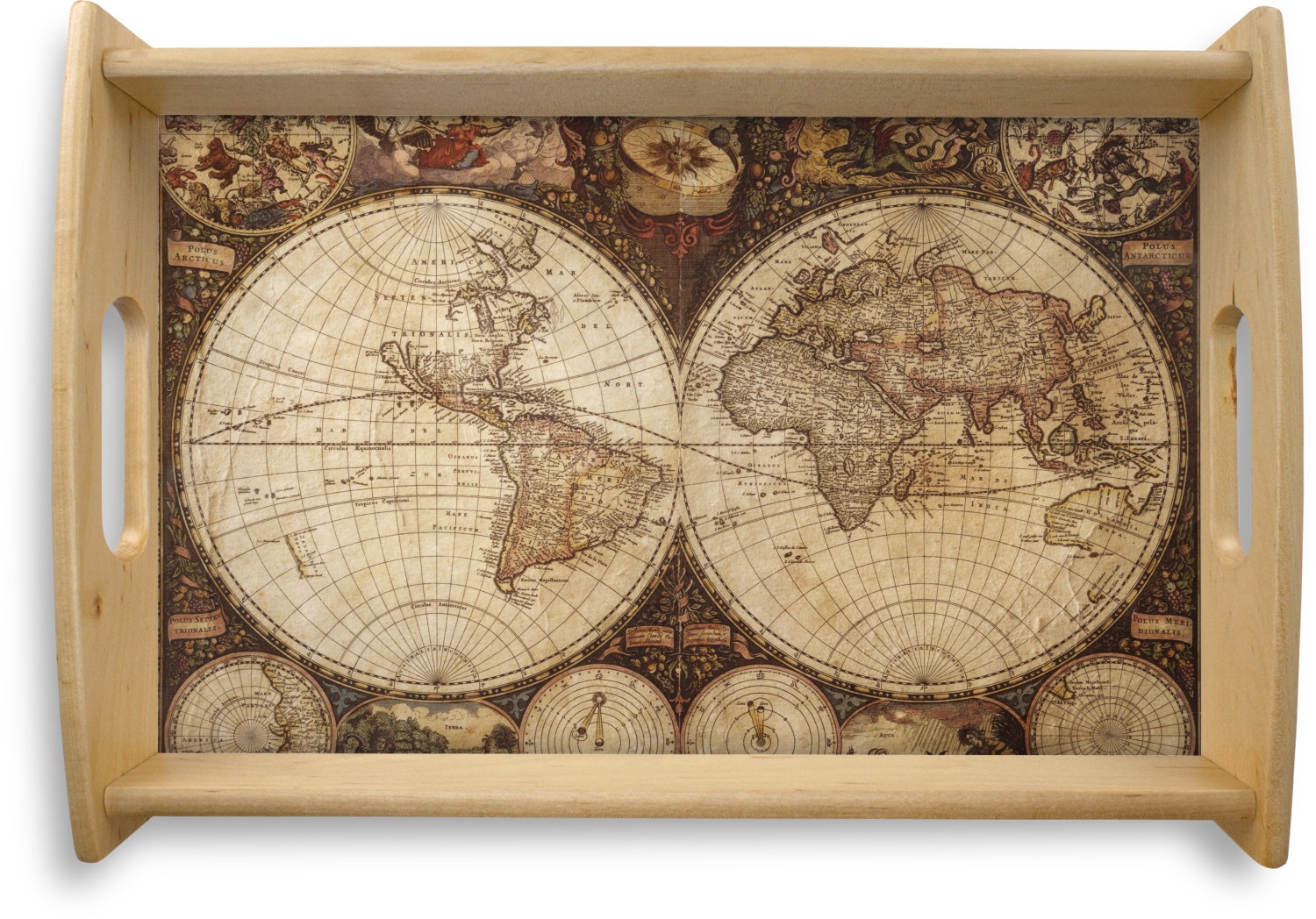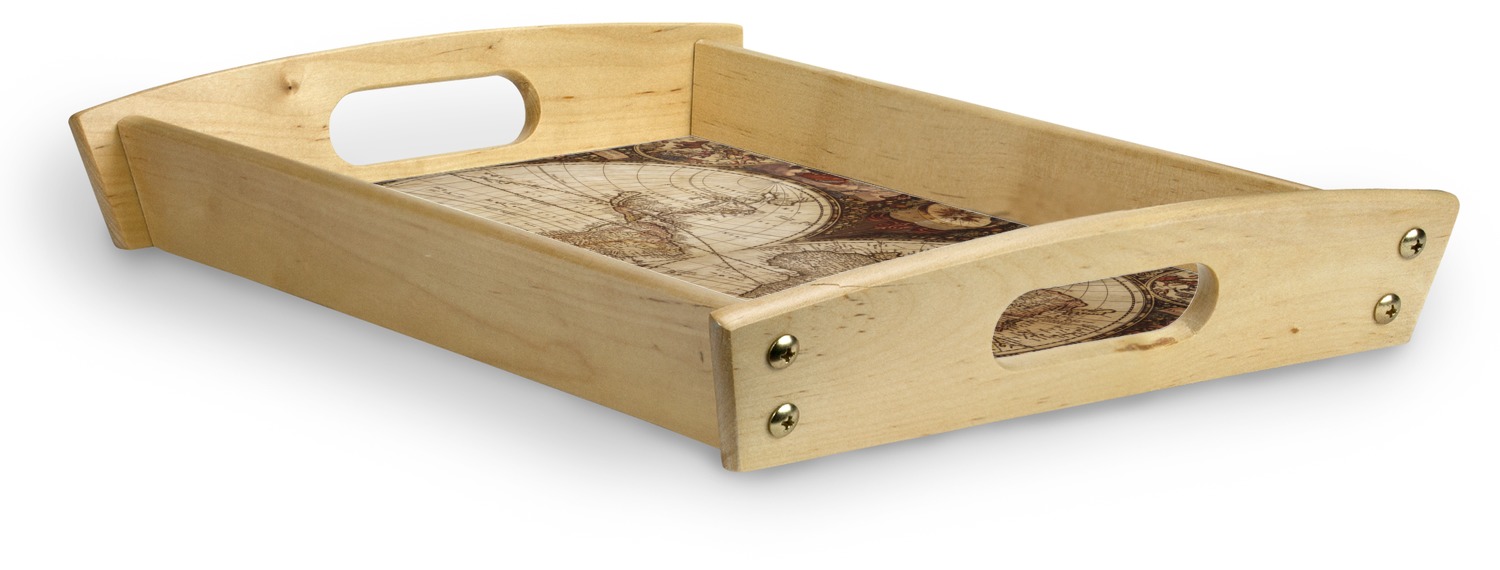 This serving tray with handles features square edges and two rounded sides, creating a very modern look. Each side is fabricated from a beautifully cut, natural wood. The bottom of the interior of the tray displays your customized design in bright, vibrant color. The tray is sold in both a black color and a natural wood look. Each variation of the wood serving tray has two sizes: Small, which is 14" x 10" x 2.25", and Large, which is 19.5" x 13.5" x 2.75".