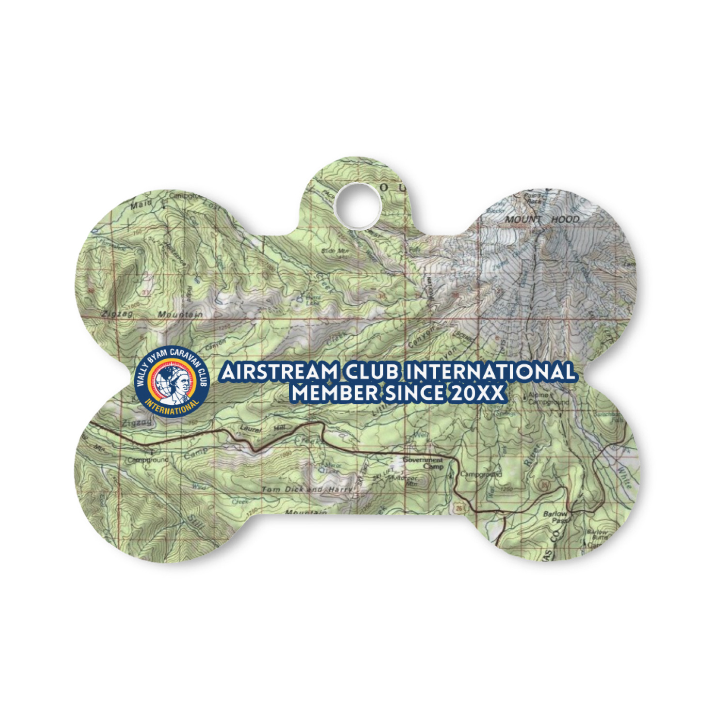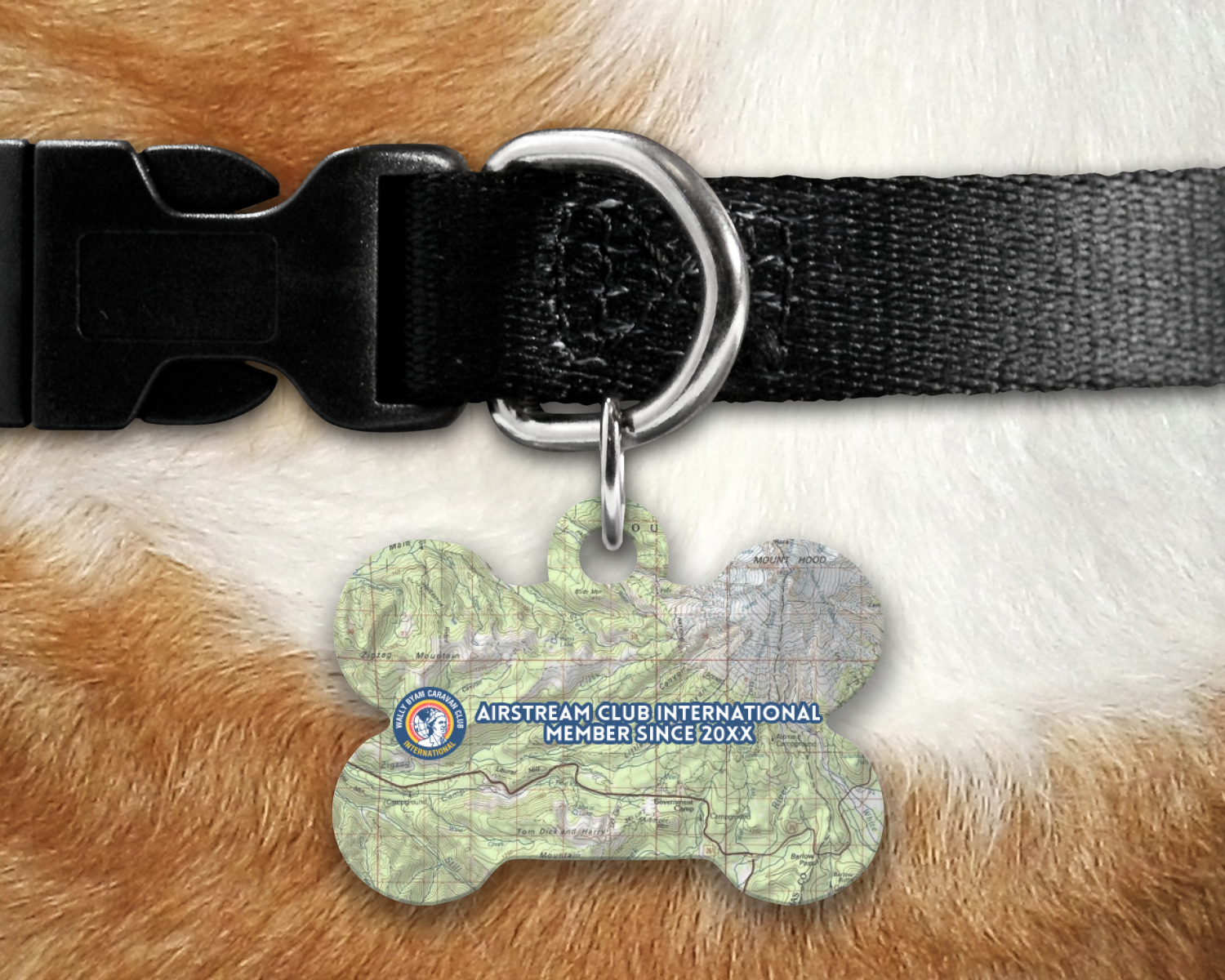 The large bone shaped dog tag measures 2" wide X 1 " tall.
