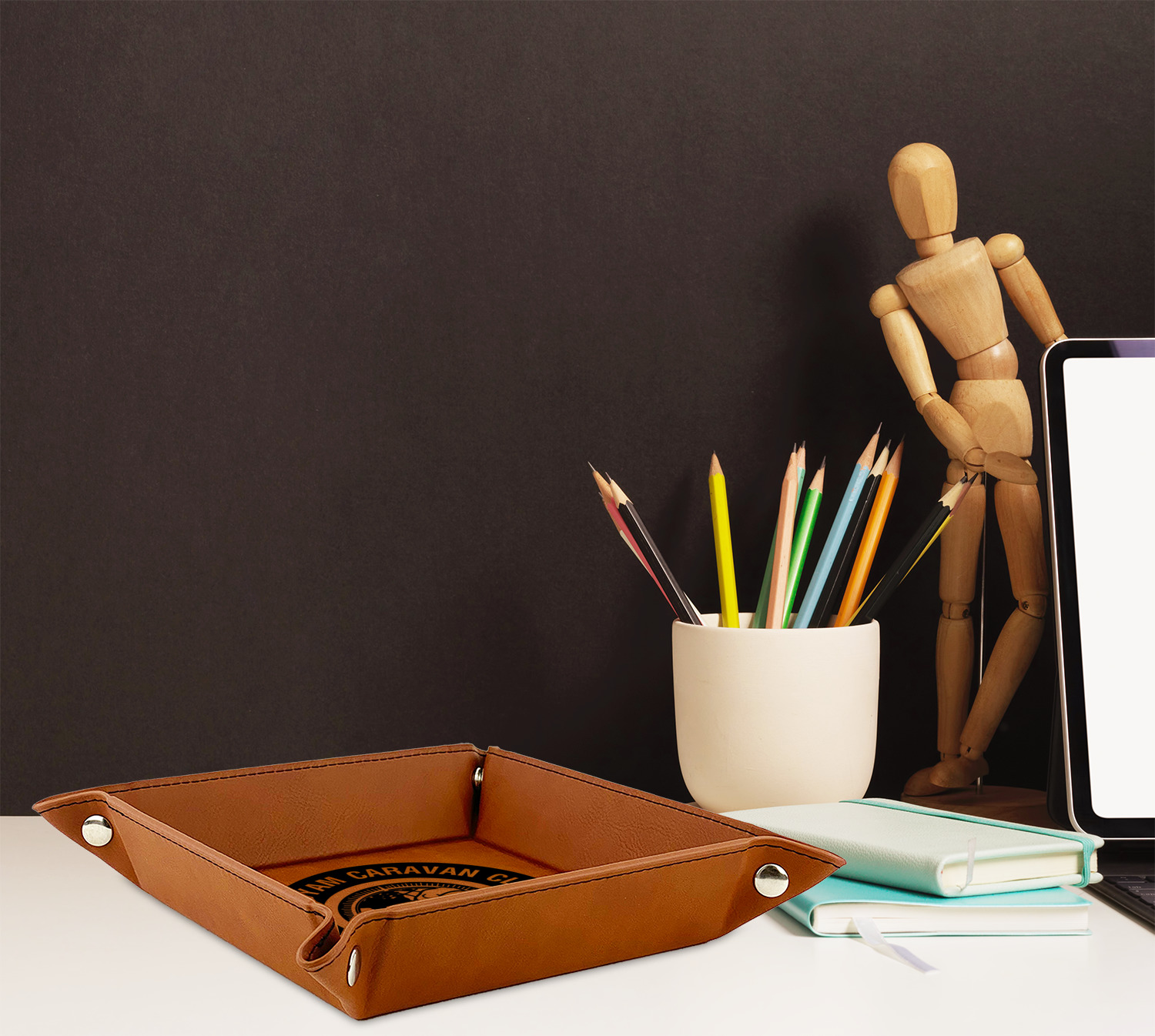 The leatherette wraps the hard board base and sides with flexible hinges to fold the sides up. The corners are secured using silver snaps. The 6in x 6 in tray measures approximately 9.5in x 9.5in when laid flat. The 9in x 9in tray measures approximately 13in x 13in when laid flat.