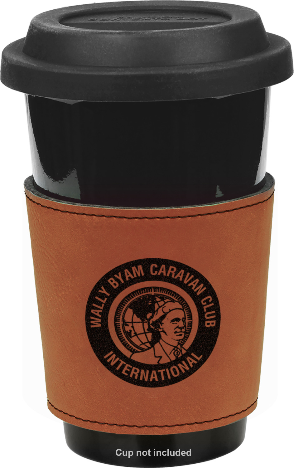 This cup sleeve is made from a suave, cognac-brown leatherette and finished with an intricate, black stitch. The interior of this can sleeve is fabricated from a thin foam material to help insulate your mug's contents. The sleeve is specifically made to suit tapered glasses or mugs, so the top's diameter is 3.5 inches, while the bottom's diameter is 2.75 inches. Your customized design will be laser engraved into the leatherette, leaving behind crisp, black imprint. With these products, we provide you with the option of engraving the front and back, or the front only.