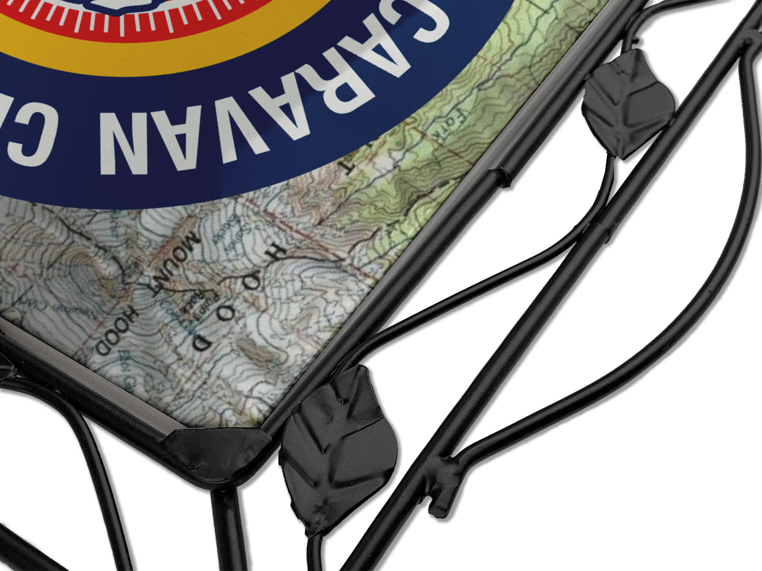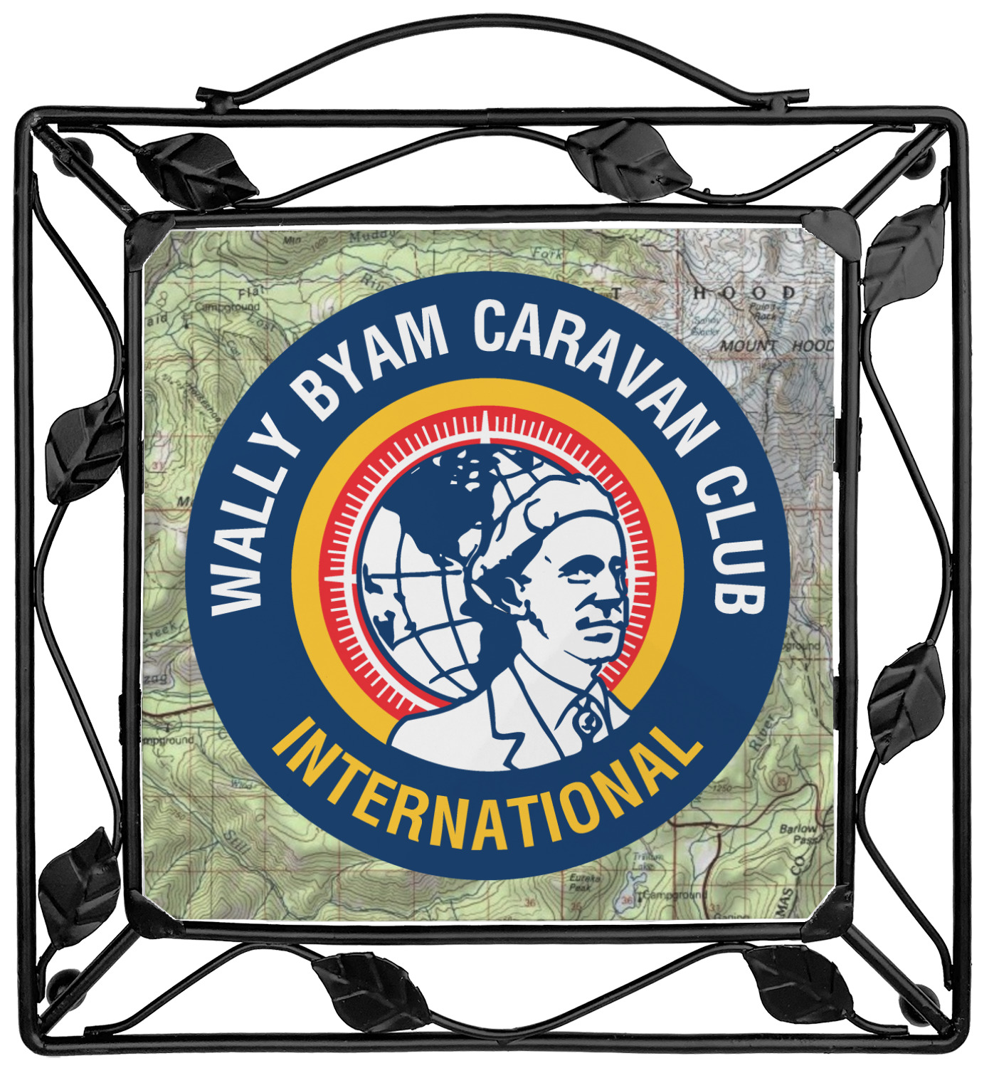 Our square trivets are made from a durable, wrought iron. This model features 4 small half circles, one on each corner, and a larger ring of iron that circles the central, customized tile. Each of the 4 corners has a round foot on its bottom for stability. This trivet is 8.75 by 8.75 inches, but the central tile measures at 6 inches on both sides.