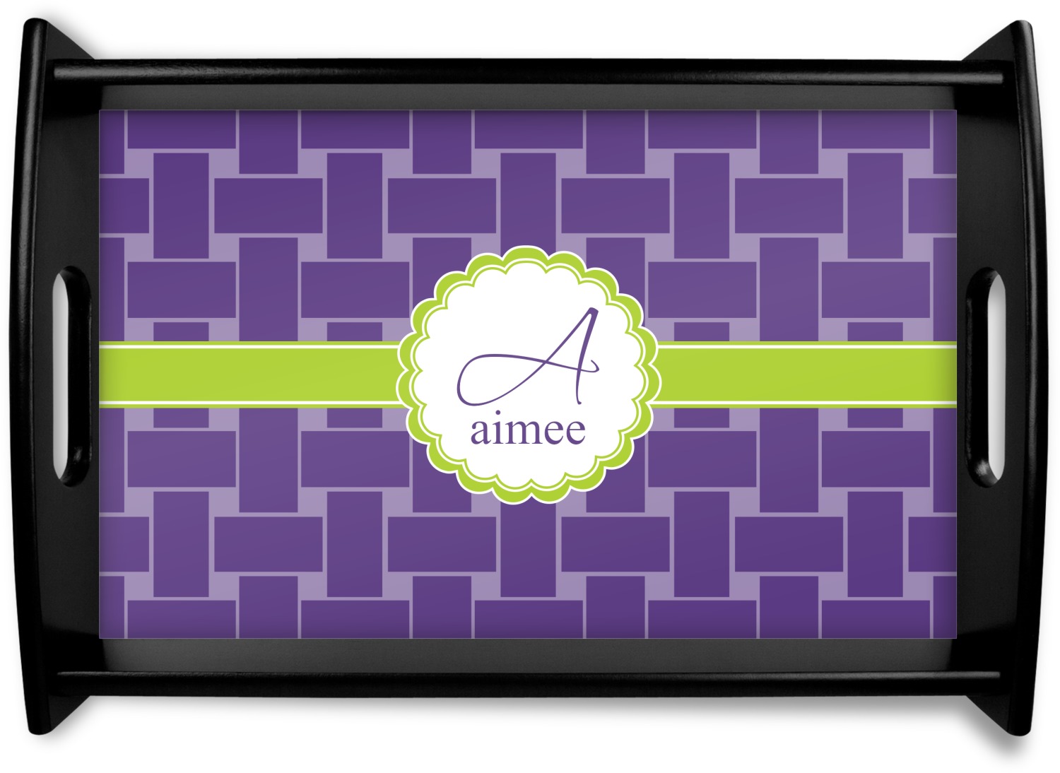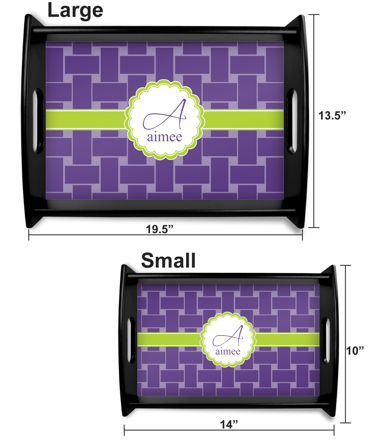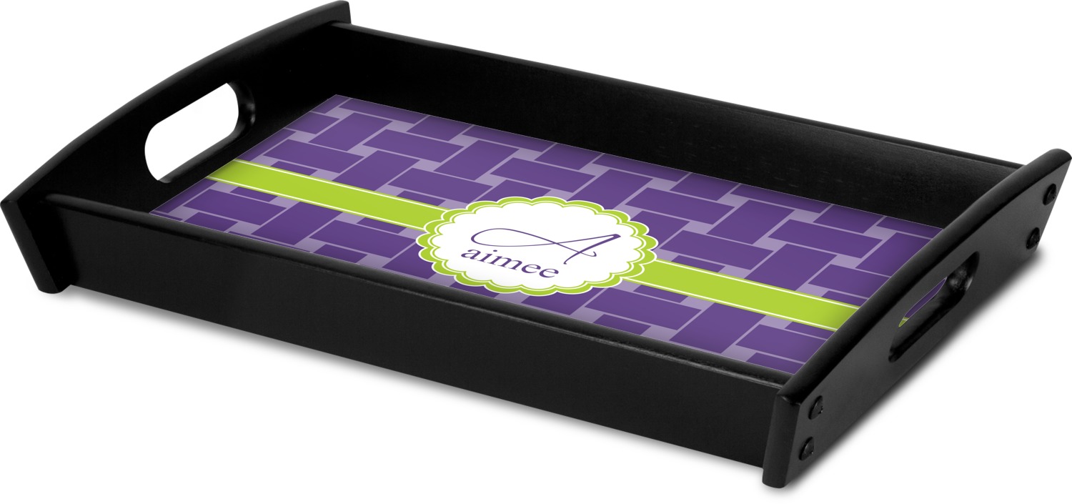 This serving tray with handles features square edges and two rounded sides, creating a very modern look. Each side is fabricated from a beautifully cut, natural wood. The bottom of the interior of the tray displays your customized design in bright, vibrant color. The tray is sold in both a black color and a natural wood look. Each variation of the wood serving tray has two sizes: Small, which is 14" x 10" x 2.25", and Large, which is 19.5" x 13.5" x 2.75".
