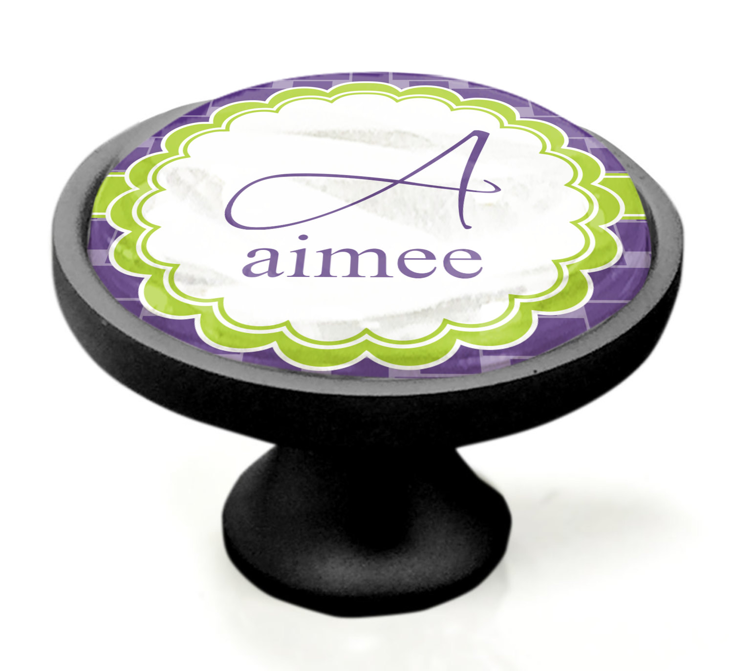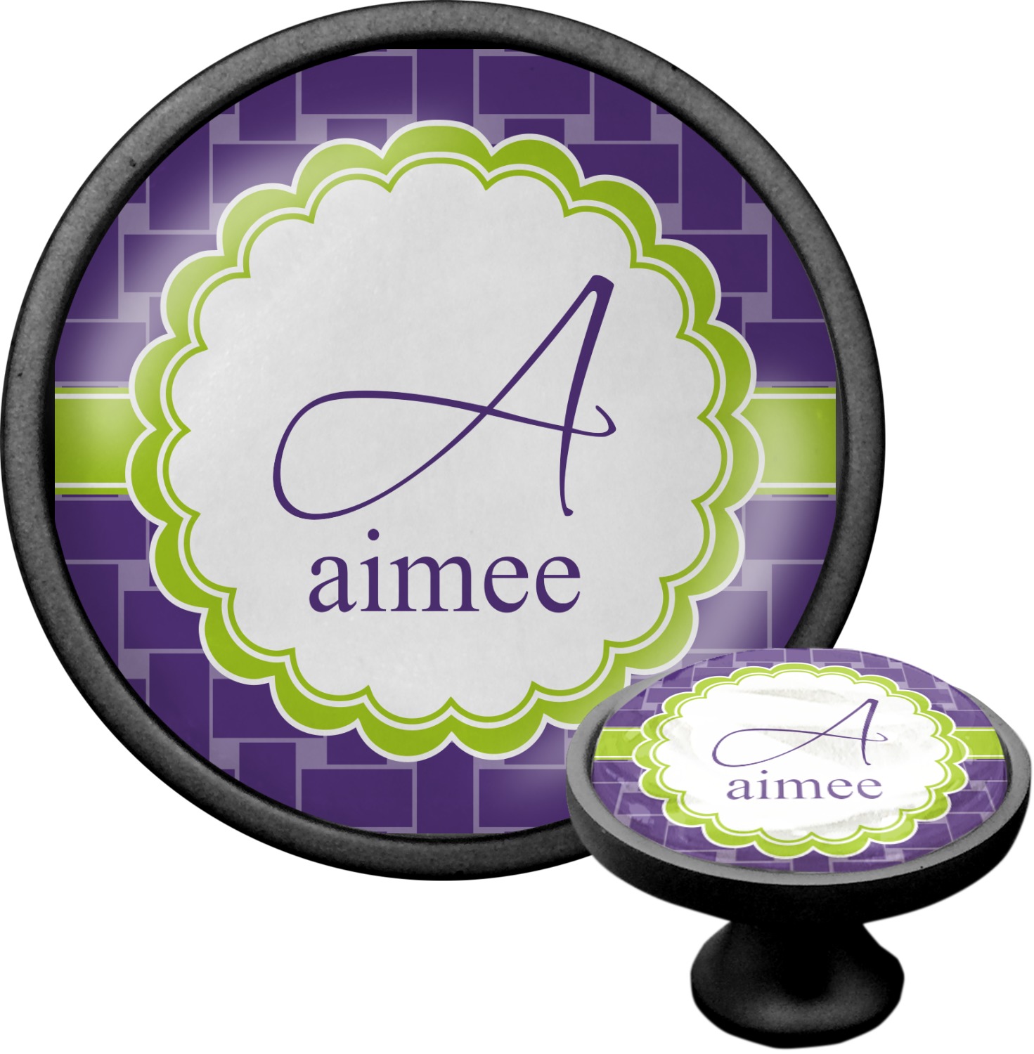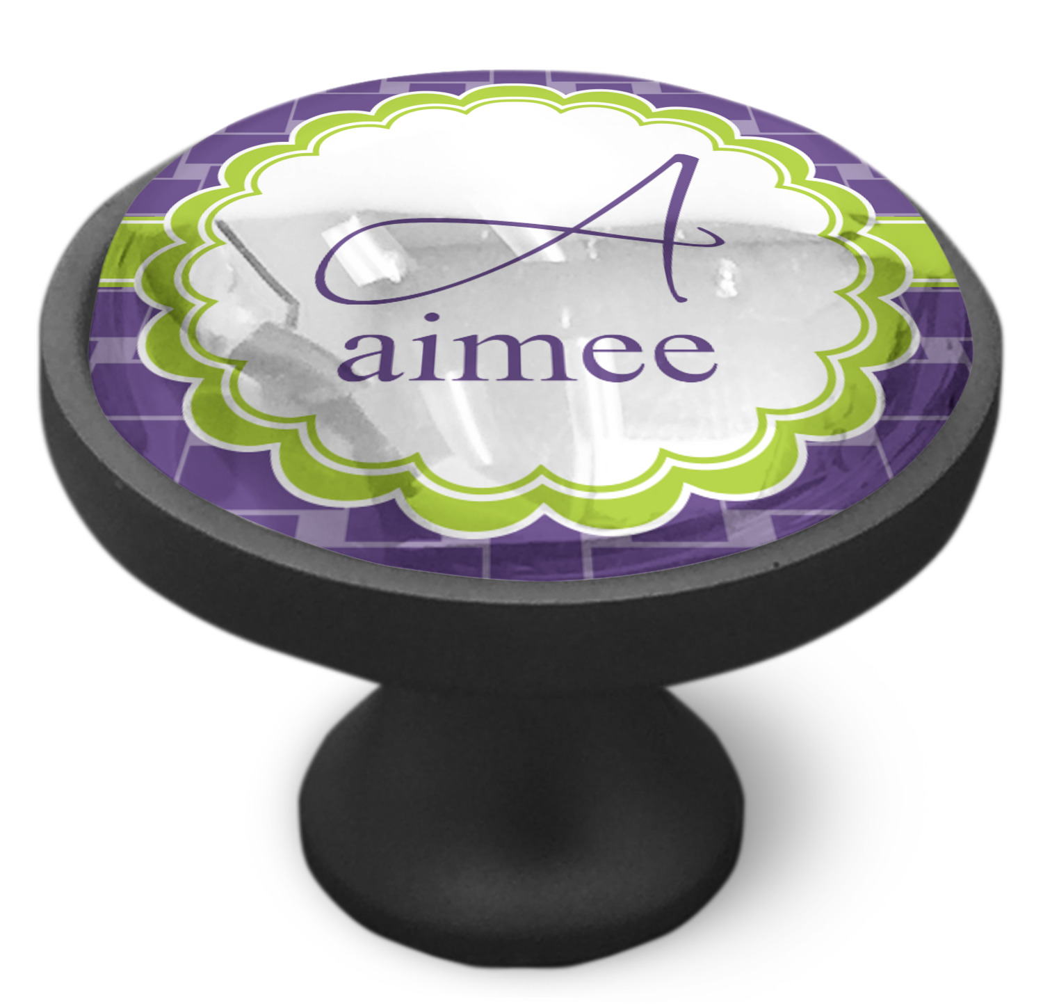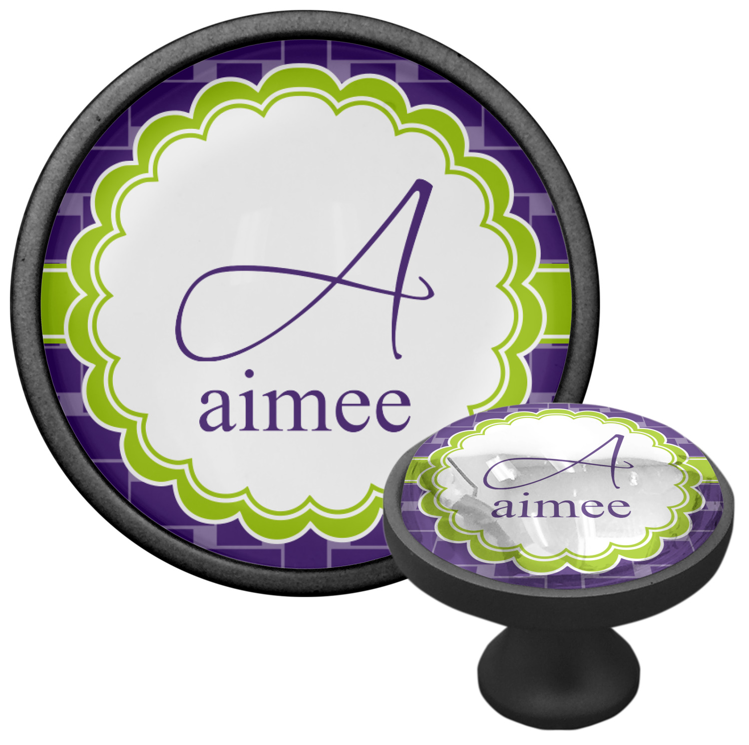 We sell these cabinet pulls in two different colors to better match your room's color scheme. We offer an oil-rubbed bronze base that is black in color, and a satin nickel option, which has a silver color. Your design is displayed across a high gloss vinyl insert that is placed on top of these cabinet handles. We then place a 1 inch thick glass cabochon atop the design, which seals the cabinet knob and makes the colors of your customization stand out. These custom cabinet knobs are approximately 1.3 inches in diameter. Your purchase includes a 1 inch screw that can be used to mount the knob to any cabinet in your home.