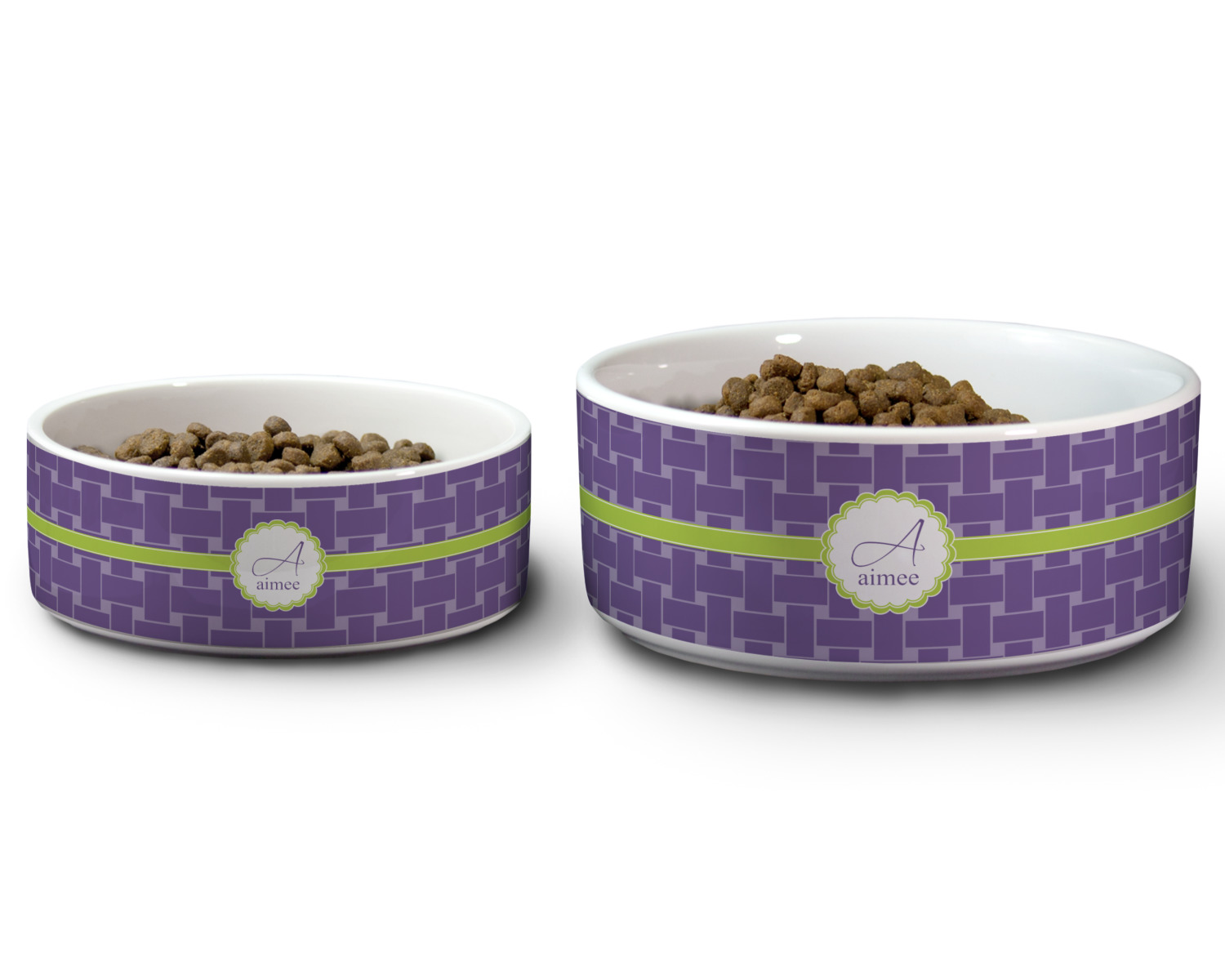 We carry these custom dog bowls in two available sizes: medium and large.The medium is 6 inches in diameter and 2.5 inches tall, and can therefore suit pets who eat up to 2.5 cups of food per meal. The large pet bowl is 7 inches in diameter and 3 inches tall, and suits pets who require up to 4.5 cups of food per meal.