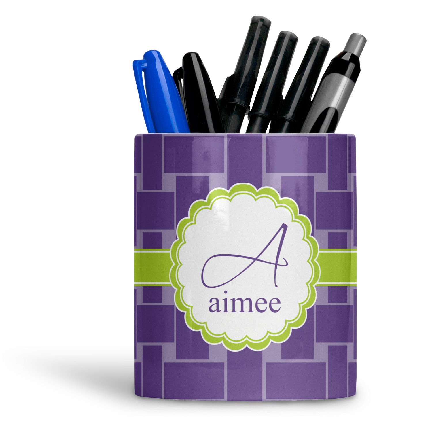 Made from white ceramic, this pen holder displays your personalized design across its surface. This pen organizer measures at 3.75" high by 3.25 inches diameter and has ample space for several pens, pencils, scissors, markers, and more! This is also a multipurpose accessory; you can use it to store makeup brushes, other utensils, and more!