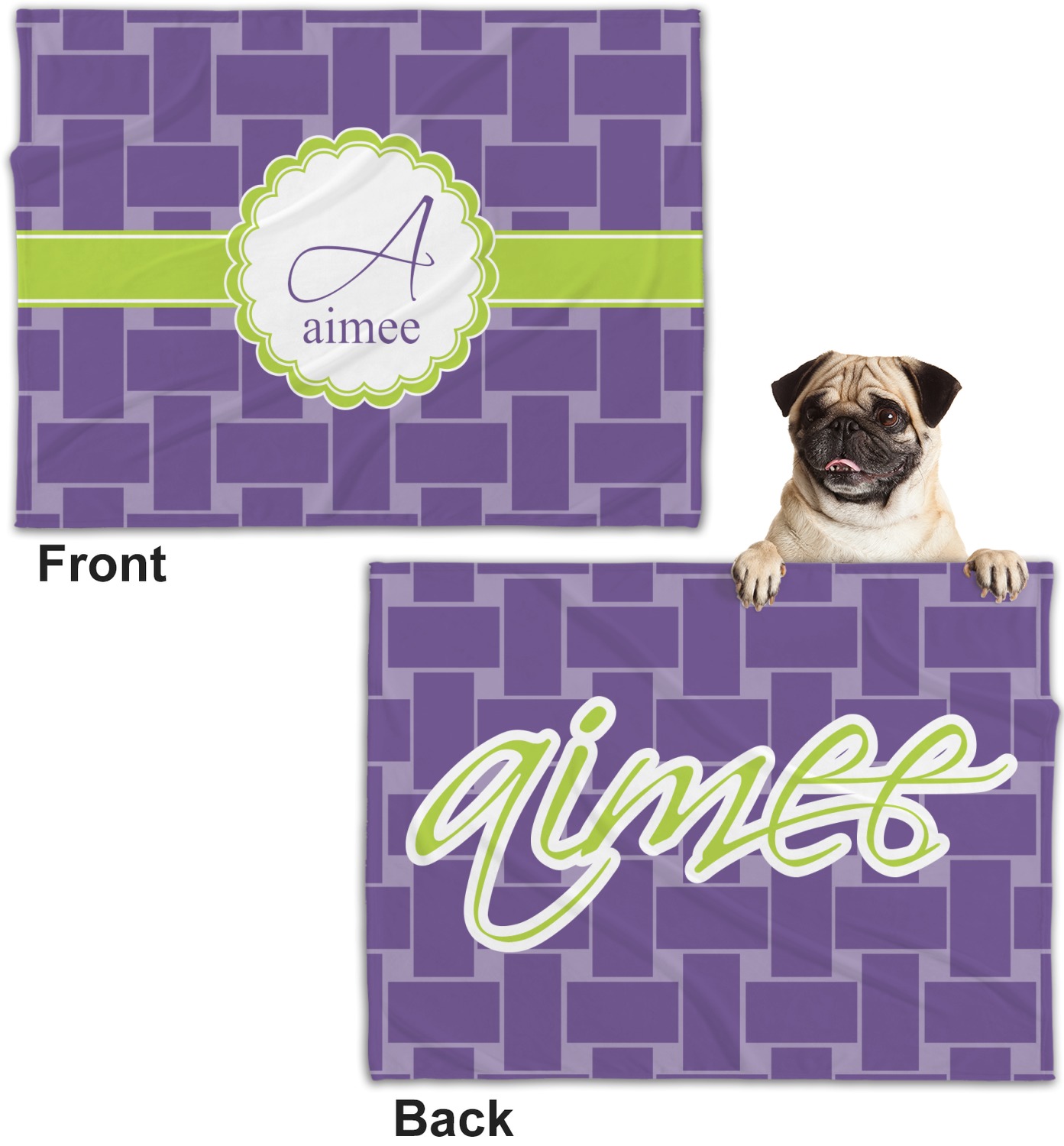 These dog blankets are crafted from a gentle, soft-to-the-touch, minky material. We print your customizations, either matching or differing, on both the top and underside of the blanket. These personalized dog blankets are available in two sizes: regular and large. Our regular size, at 40" x 30", accommodates small and some medium size dogs. At 60" x 50", our large dog blanket is a better fit for bigger breeds. Though specialized for dogs, these blankets still make a thoughtful gift for your favorite feline, or any other pet in mind!
