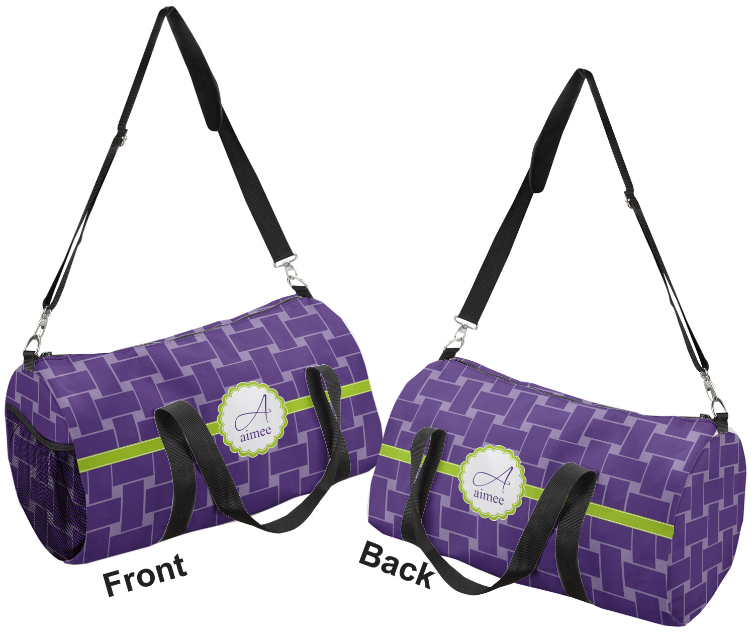 This duffle is a sturdy bag made of a canvas material. It comes in two sizes: Small (19"W x 9.5"H x 9.5"D) and Large (23"W x 12"H x 12"D). The bag is a cylindrical shape with a black adjustable strap and two handles. On one side is an elastic pouch to put a waterbottle or other small item. Your product will be sublimated with your design and is able to be designed on the front, back, and sides. Be sure to remember that the straps may cut into parts of your design if you upload your own artwork.