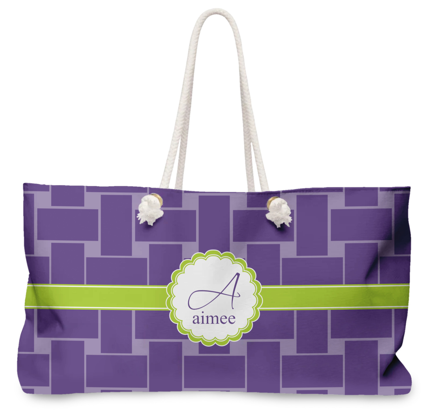Our oversized weekender tote with rope handles is perfect for your weekend at the beach or on the town. This large tote are 24" W X 13" H, with a 5" gusset and a 27" thick rope handles with a knot that is put through a grommeted brass hole.