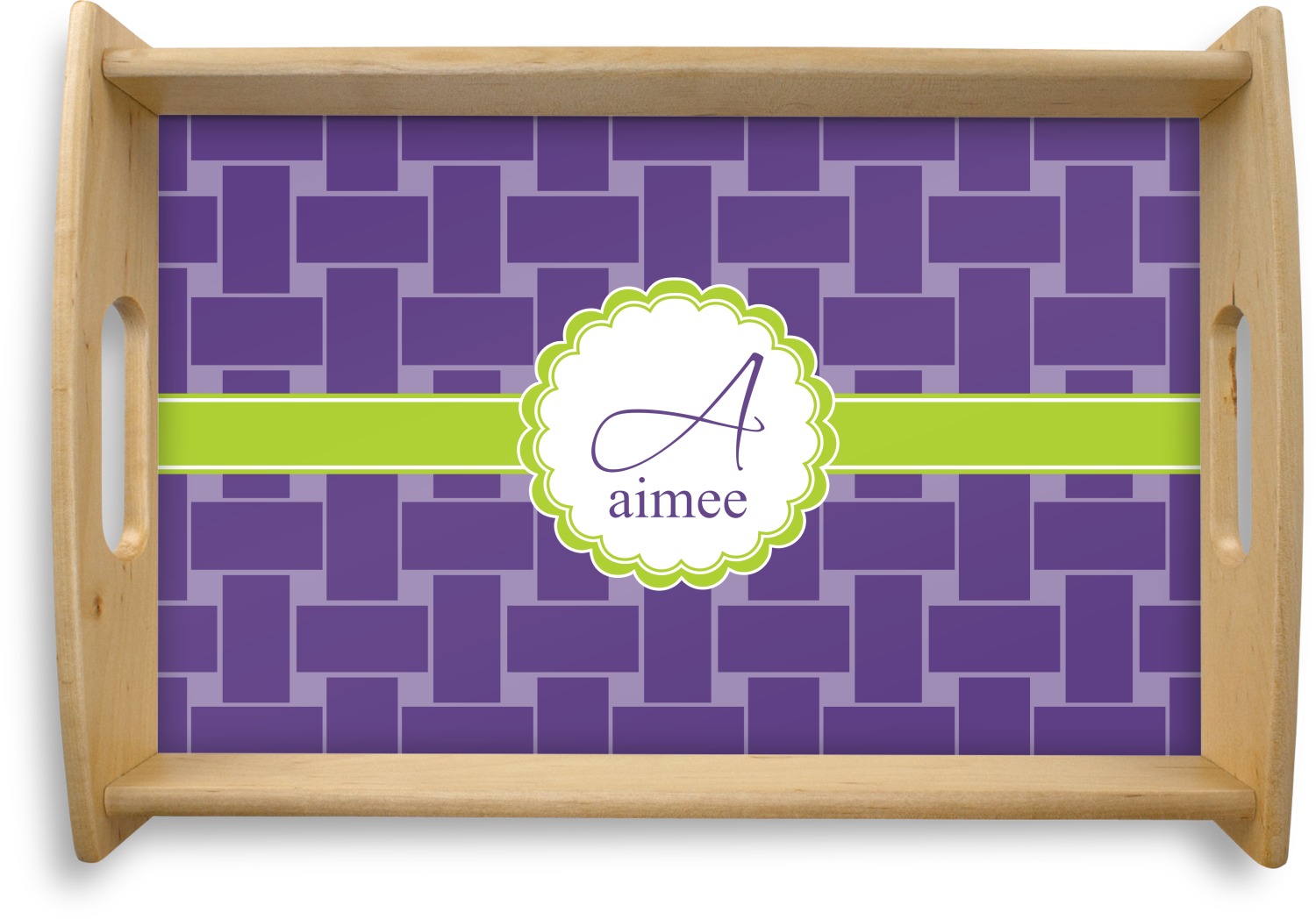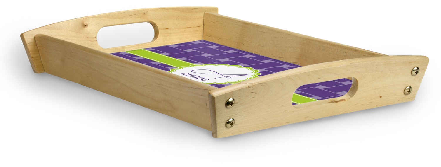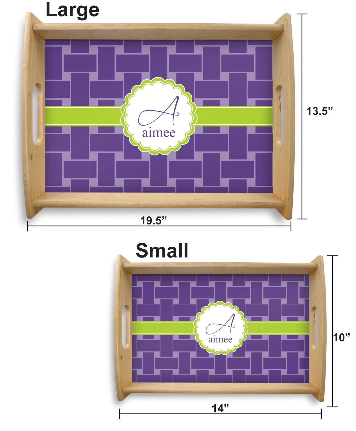 This serving tray with handles features square edges and two rounded sides, creating a very modern look. Each side is fabricated from a beautifully cut, natural wood. The bottom of the interior of the tray displays your customized design in bright, vibrant color. The tray is sold in both a black color and a natural wood look. Each variation of the wood serving tray has two sizes: Small, which is 14" x 10" x 2.25", and Large, which is 19.5" x 13.5" x 2.75".