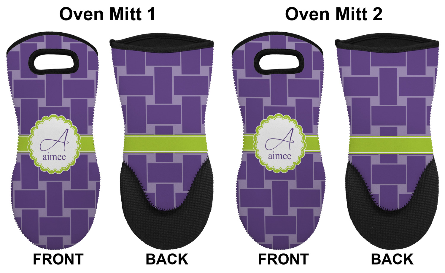 These heat resistant gloves are made entirely of a durable neoprene; the front features a softer texture, while the palm's side has a textured surface, meant to handle heat up to 500 degrees Fahrenheit. Thick, heavy duty stitching connects the two sides. A small, oval cutout appears on the front, and can be used to hang and store the mitt. Your personalization appears on the front, and the upper part of the back of the mitt. The style of these oven mitts are suitable for both the right and left hand, depending on your needs. If you need one for each hand, be sure to order two!