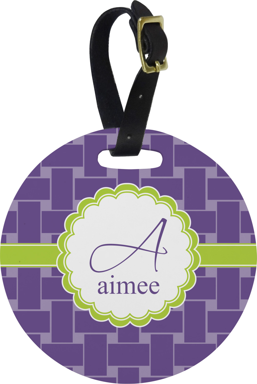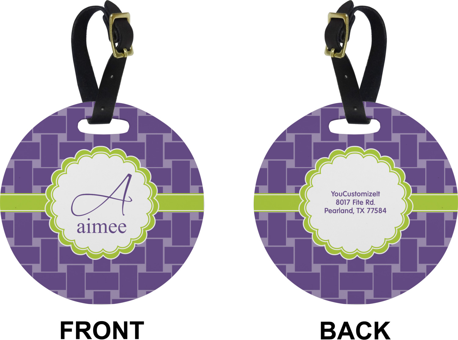 These personalized bag tags are sold in a variety of shapes, so that you may find the product that meets your vision exactly. We sell a round luggage tag, which measures at approximately 4" x 4". Our square luggage tag is about 3.5" x 3.5", while our rectangular version is 2.75" x 4 ".