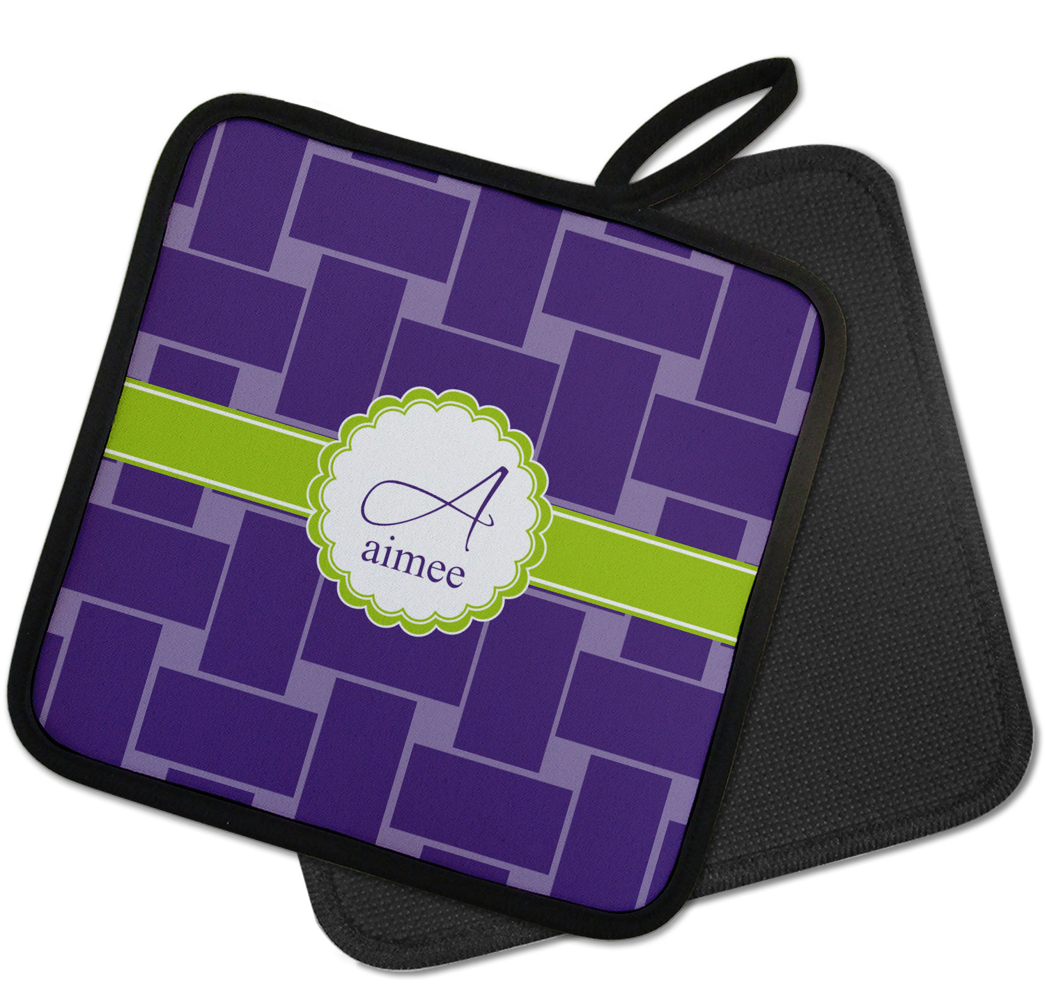 Our personalized pot holders feature a neoprene front that displays your personalization in vibrant colors. The backing of the hot pot holder is rubberized; the textured backing allows you to have a great grip when using this custom pot holder. The two materials are joined with a sleek, black trim, and the holder also includes an attached loop for hanging and storage. The pot holder is approximately 8.75 inches by 8.75 inches and 0.25 inches tall, while the fabric loop is 2.5 inches long. You can purchase a kitchen pot holder by itself or as a set of 2. We also offer a set including one pot holder and one oven mitt.