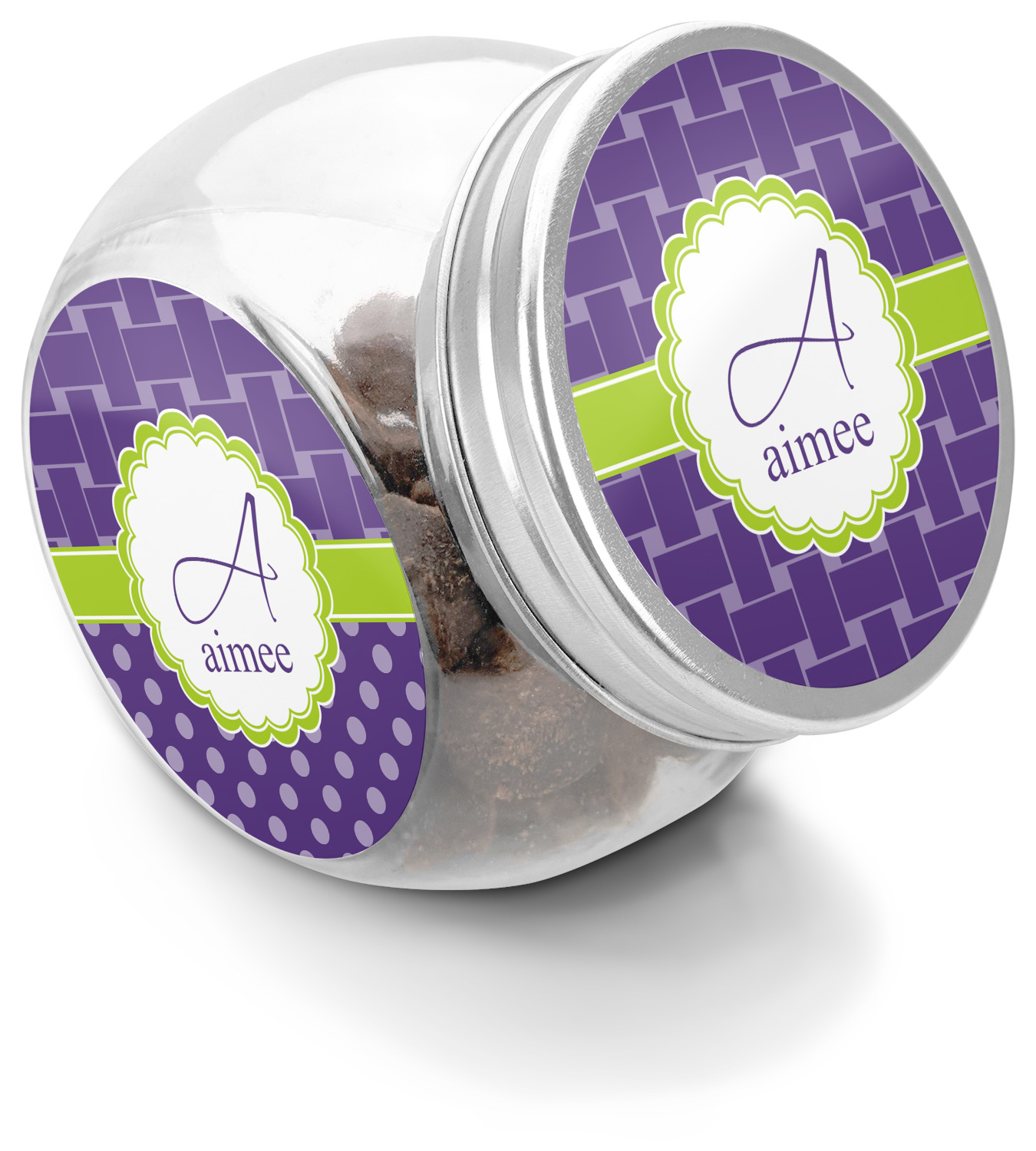This treat jar is an excellent way to store treats for your favorite canine or feline. Moreover, their delicate, classy appearance makes them a tasteful addition to your countertop's décor. Crafted from clear glass, its unique construction and silver metal, screw-on lid allows for quick and easy access. Three, permanent, vinyl stickers are applied to both sides of the jar and lid, presenting your personalized design. The base of this glass, dog treat jar is 3.4" x 4.75", and the jar stands at 5" tall. Though on the smaller side, this jar is best suited for smaller treats or training treats.