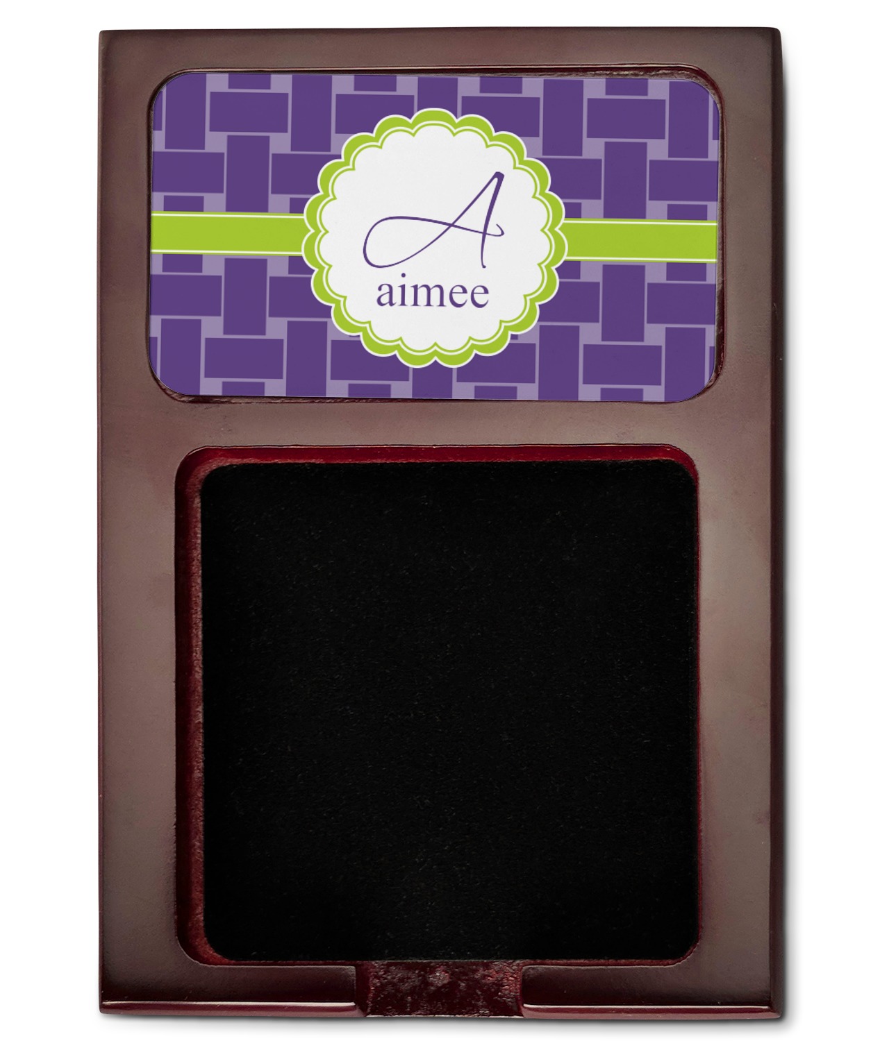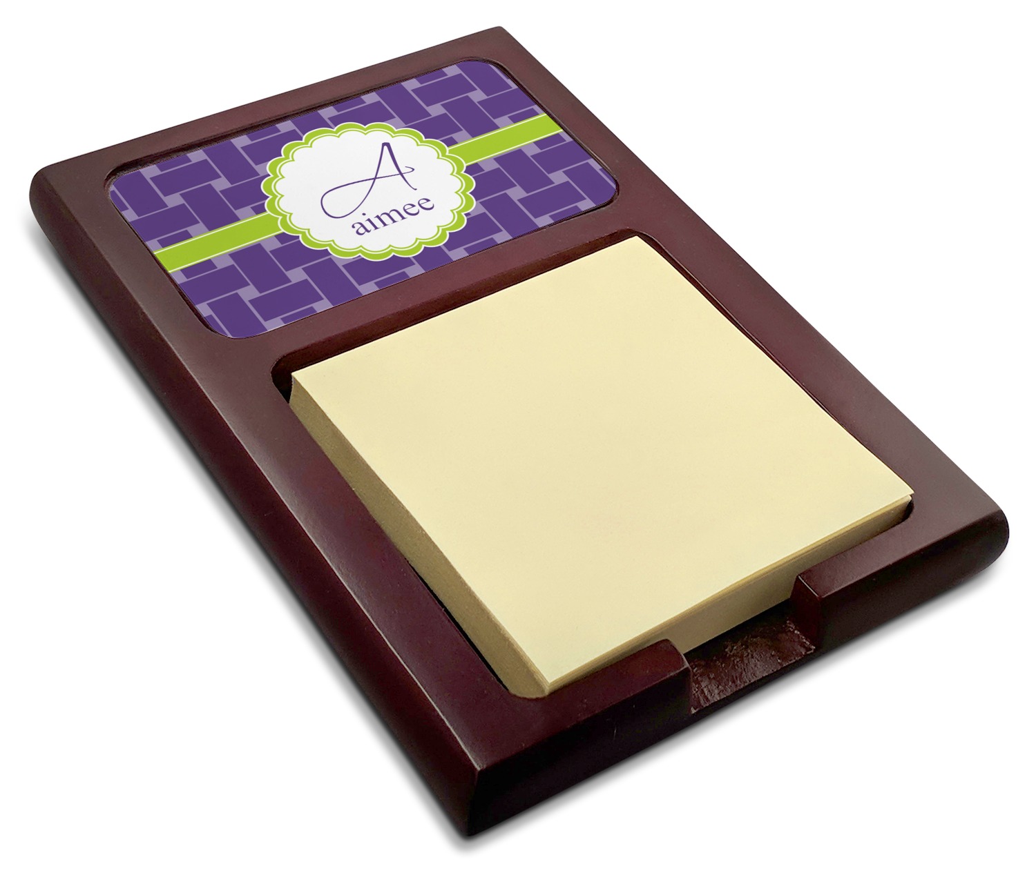 Crafted from a fine mahogany, this post it note holder is in the shade of a dark, cherry color. The dispenser itself is about 4.25 by 6.25 by 0.75 inches. You can place your 3 by 3 inch sticky notes in the indentation below the nameplate. We print your customization onto the nameplate that rests above the velvety indentation.