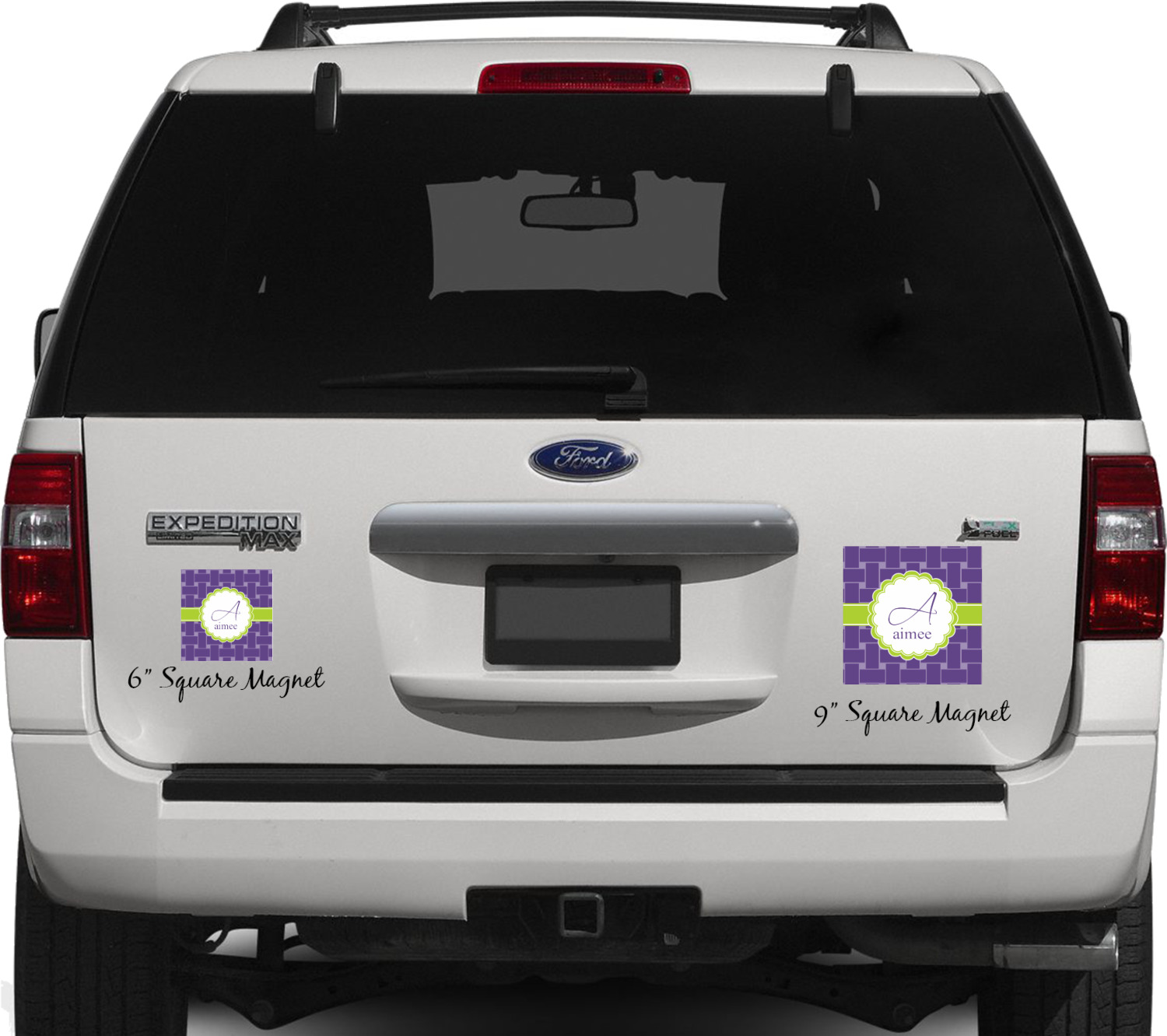 Your personalized car magnets are available for purchase in two shapes and two sizes. We carry round and square editions; each shape can either be 6 by 6 inches, or 10 by 10 inches, depending on your needs. Both versions are 1 millimeter thick, which is considered, within the industry, as the ideal thickness for automobile magnets. The magnetic car decals will adhere to any smooth, metal surface of your cars body, such as the trunk door or a side panel. However, please note that some vehicles are constructed from fiberglass bodies, which prevents the adhesion of anything magnetic. We advise that you test your vehicle before purchasing these magnets.