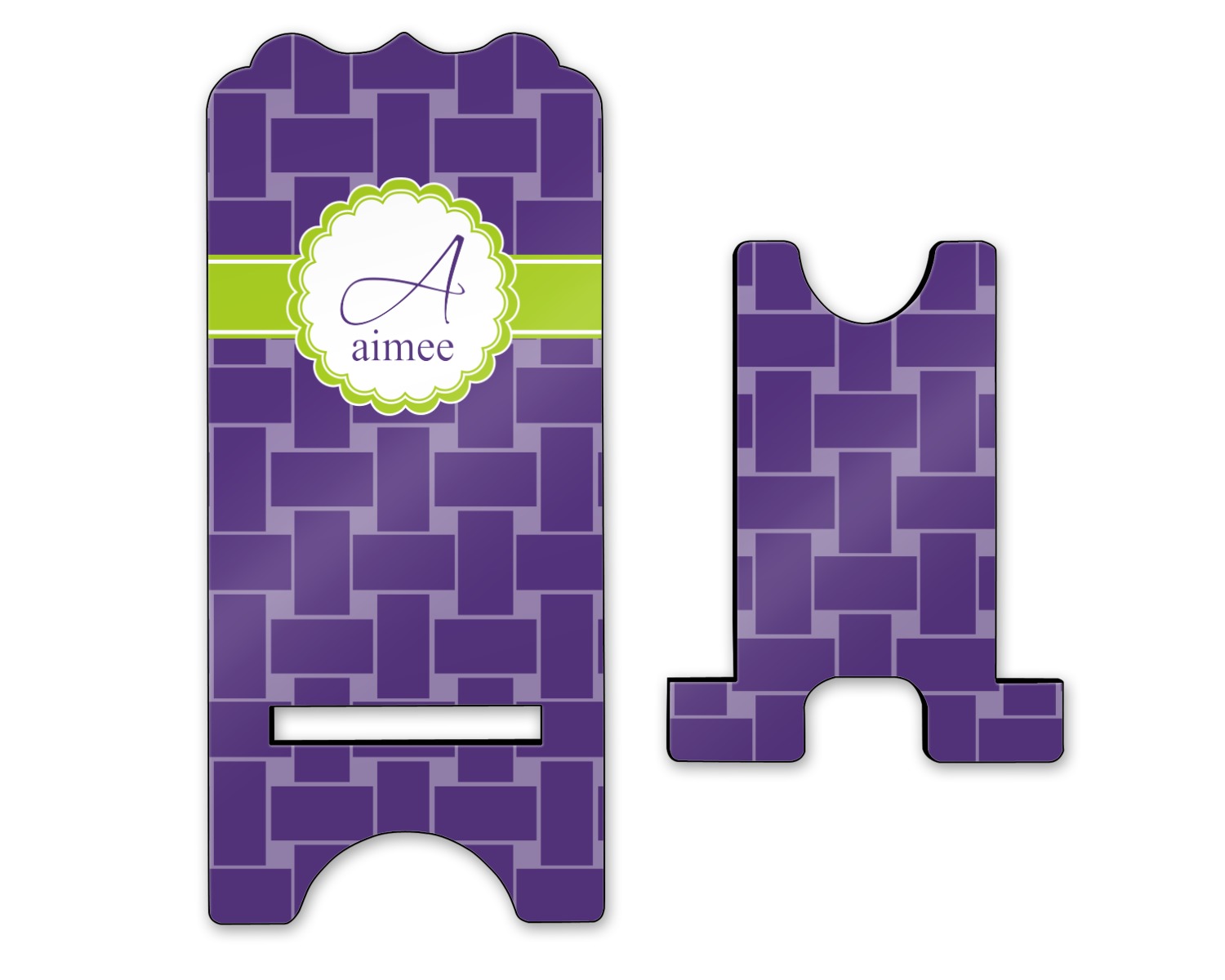 To meet your needs, we offer four variations of this IPhone stand. The backboard of the first version is shaped as a plain, yet sleek rectangle, and is available in two sizes. Our smaller size is approximately 4 by 3.25 by 7 inches, while the larger model is 4 by 3.77 by 8.5 inches. Alongside this model, we also provide you with a more decorative option. The upper part of our second version features a curved edge, for a classy, suave appearance. This phone holder is also sold in two sizes: a smaller version, which is 4 by 3.25 by 7 inches, and our larger model, which is 4 by 3.77 by 8.5 inches. Both models will support large phones, but the larger model is better if you wish to proudly display your personalized design.