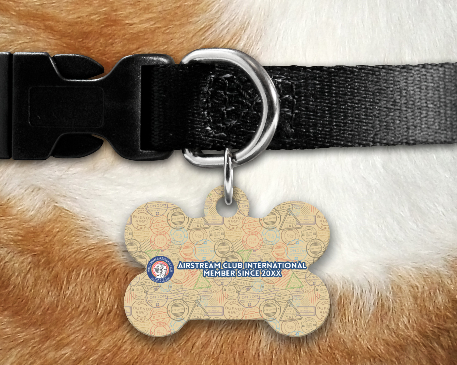 The large bone shaped dog tag measures 2" wide X 1 " tall.