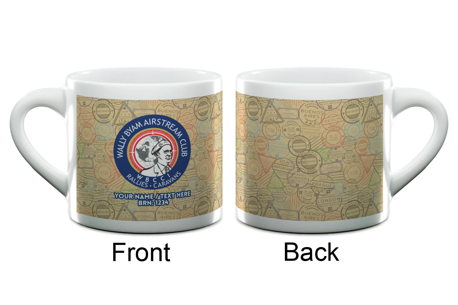 Each of our espresso mugs is a ceramic material sure to keep your drink warm. Personalize one cup for yourself, or order a set of 4! Its the perfect little gift for any coffee lover! We carry two sizes for you to personalize - 3 oz. (approx. 3.25" x 2.325" x 2.625") or 6 oz. (approx. 4" x 2.9" x 2.9"). Our 3 oz. mug is perfect for that single shot espresso while our 6 oz. mug can be your next favorite cappuccino cup holding two shots of espresso!
