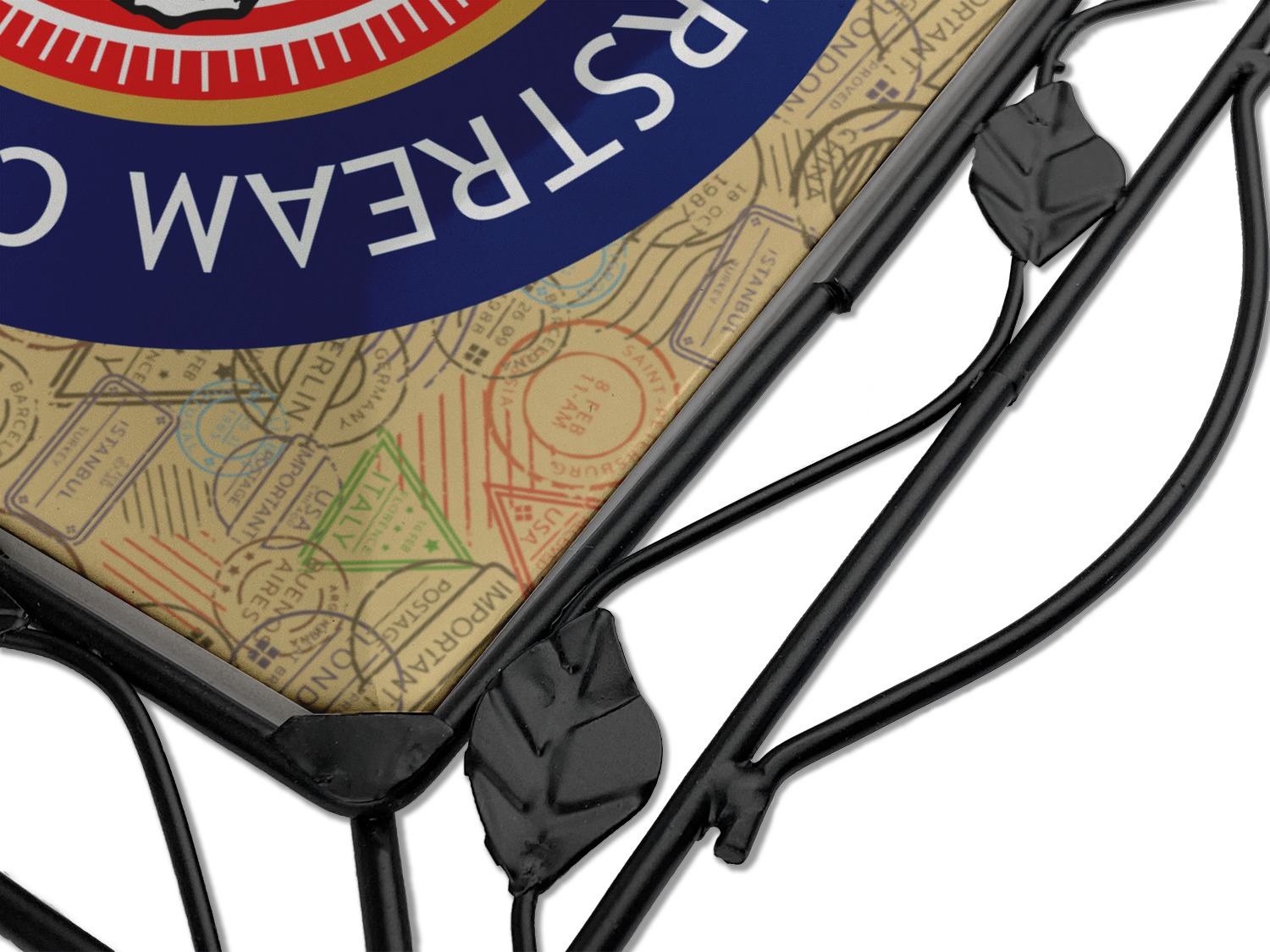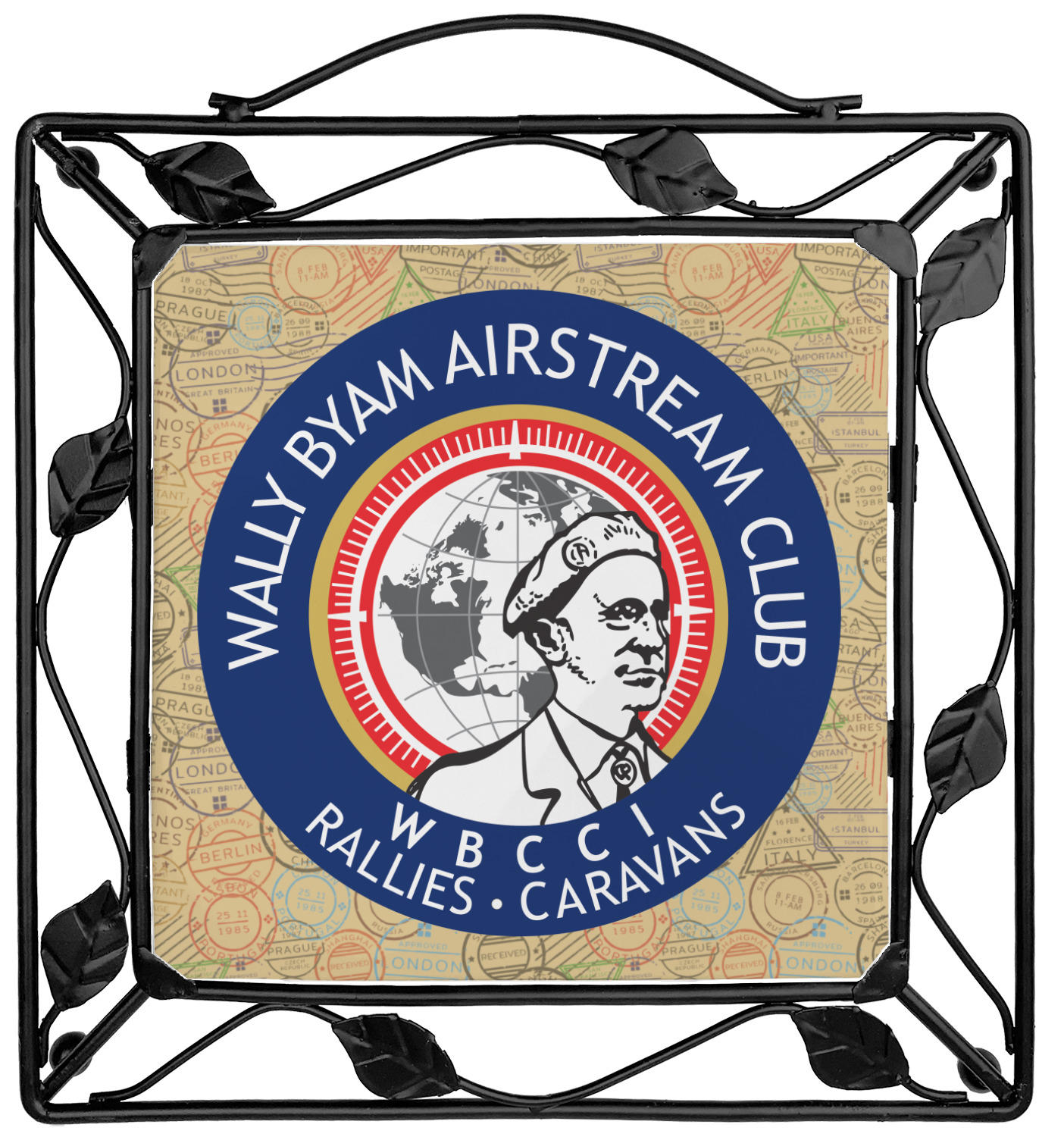 Our square trivets are made from a durable, wrought iron. This model features 4 small half circles, one on each corner, and a larger ring of iron that circles the central, customized tile. Each of the 4 corners has a round foot on its bottom for stability. This trivet is 8.75 by 8.75 inches, but the central tile measures at 6 inches on both sides.