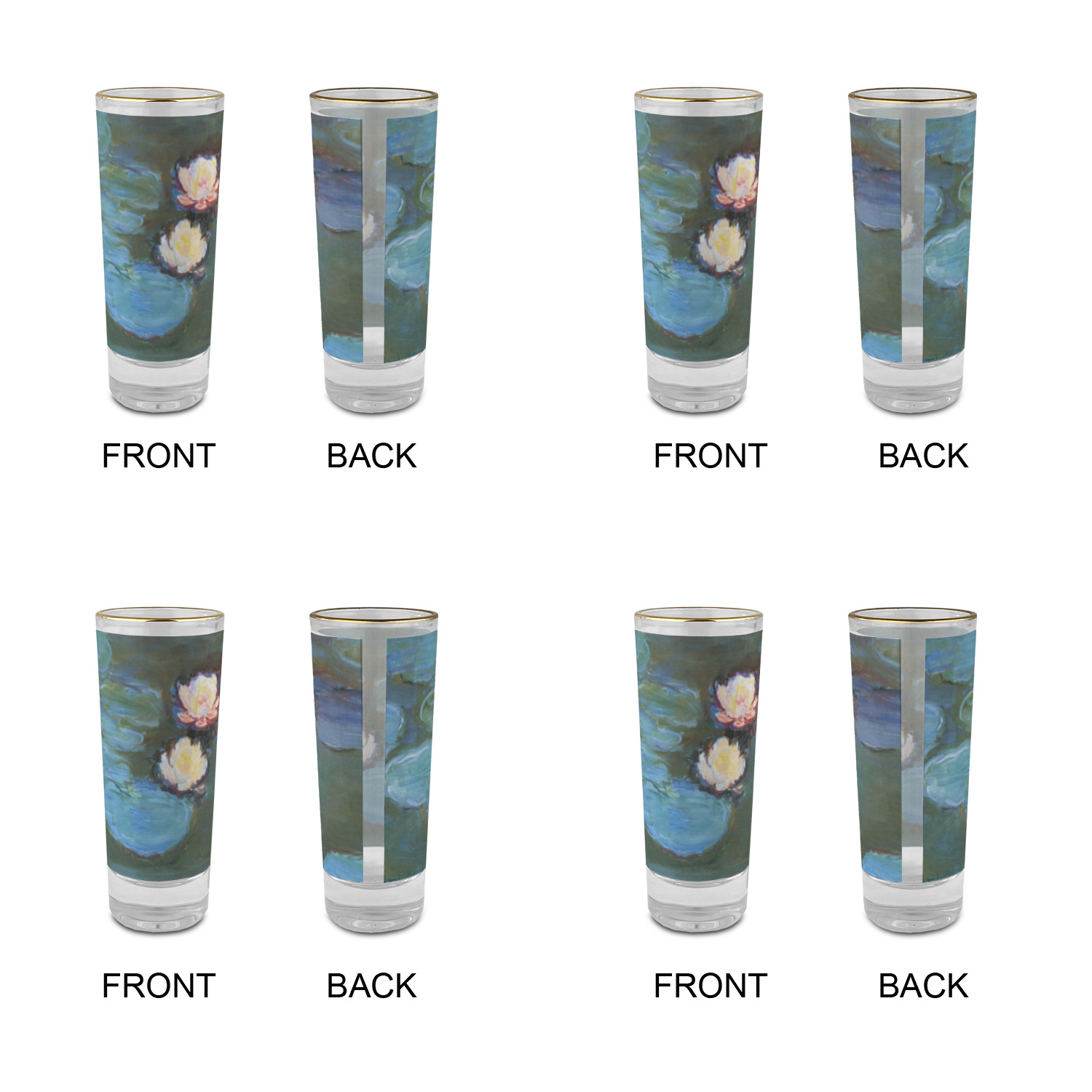 These glass shooter glasses are printed in full color with the design of your choice. These are a tall shooter 2 oz size and stand 4" tall. The print is a full wrap design to boldly display your personalization.