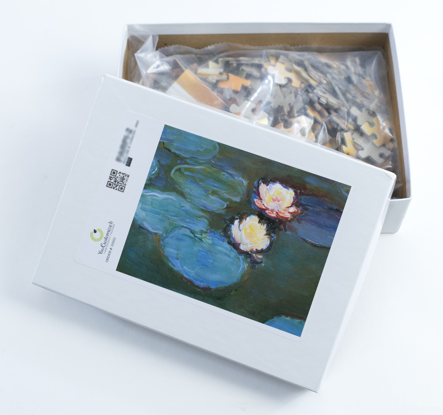 We print our puzzles on thick white chipboard in vibrant colors, then laminate the chipboard and die cut your puzzle. Your jigsaw puzzle is shipped to you in a box with the image of the puzzle on the box.