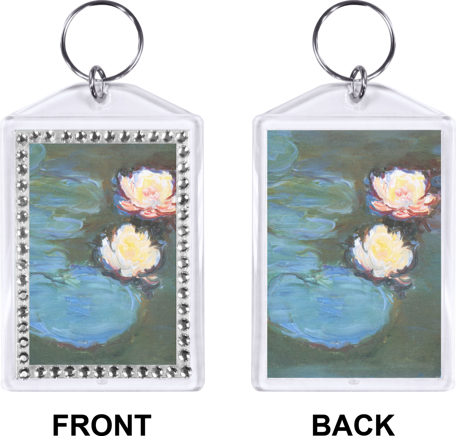 Our personalized keychains have a bold, rectangular shape, outlined by a series of shimmering rhinestones. A metal, split keyring is included with your purchase, and an additional metal hoop allows for attachment of the keychain to the split ring. This unique keychain measures at about 3.75 by 2.5 inches. We print your customized design(s) across both the back and front of this keychain.
