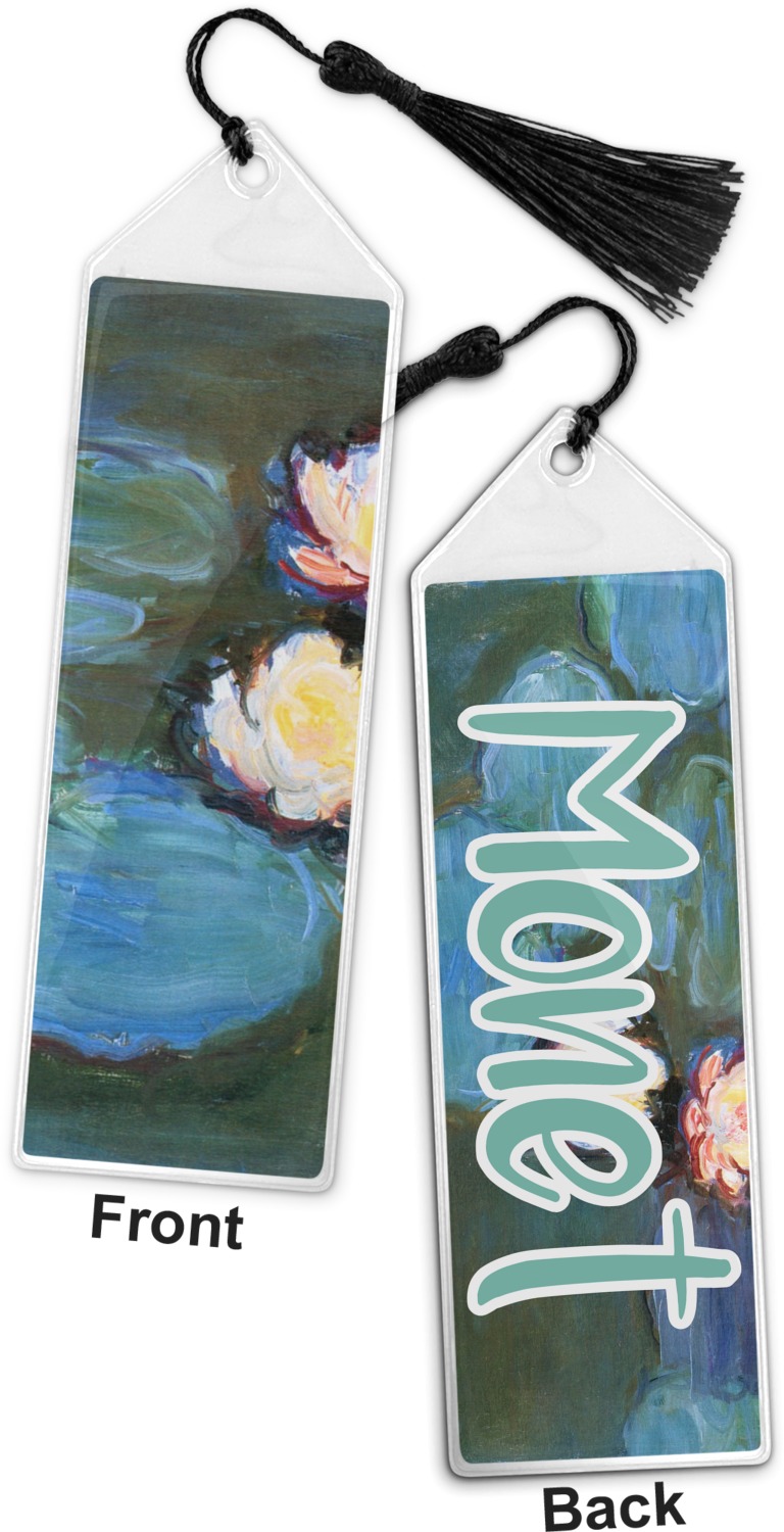 Your personalized bookmark is made of a sturdy, clear vinyl, and is approximately 7.5" x 2.25". We display your personalization on vinyl inserts that are placed on both sides. Accompanying each book marker is a black, fringe tassel that attaches to the reinforced, triangular header.