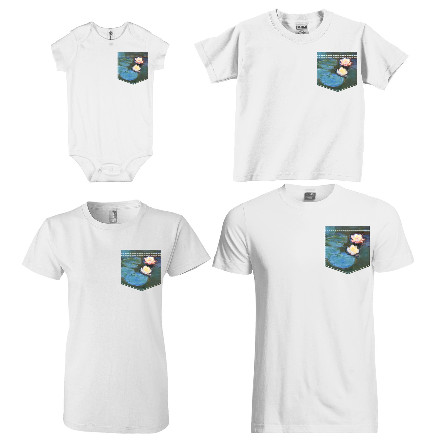 The faux pockets are available in 4 different sizes - for baby, kids, youth/women & men; the whole family can have the same pocket design, but sized just for them! The pockets are printed using our direct-to-film technology to the exact shape & size. We have faux stitching around the pocket, with double stitching on the top of the pocket to give it the authentic pocket look!