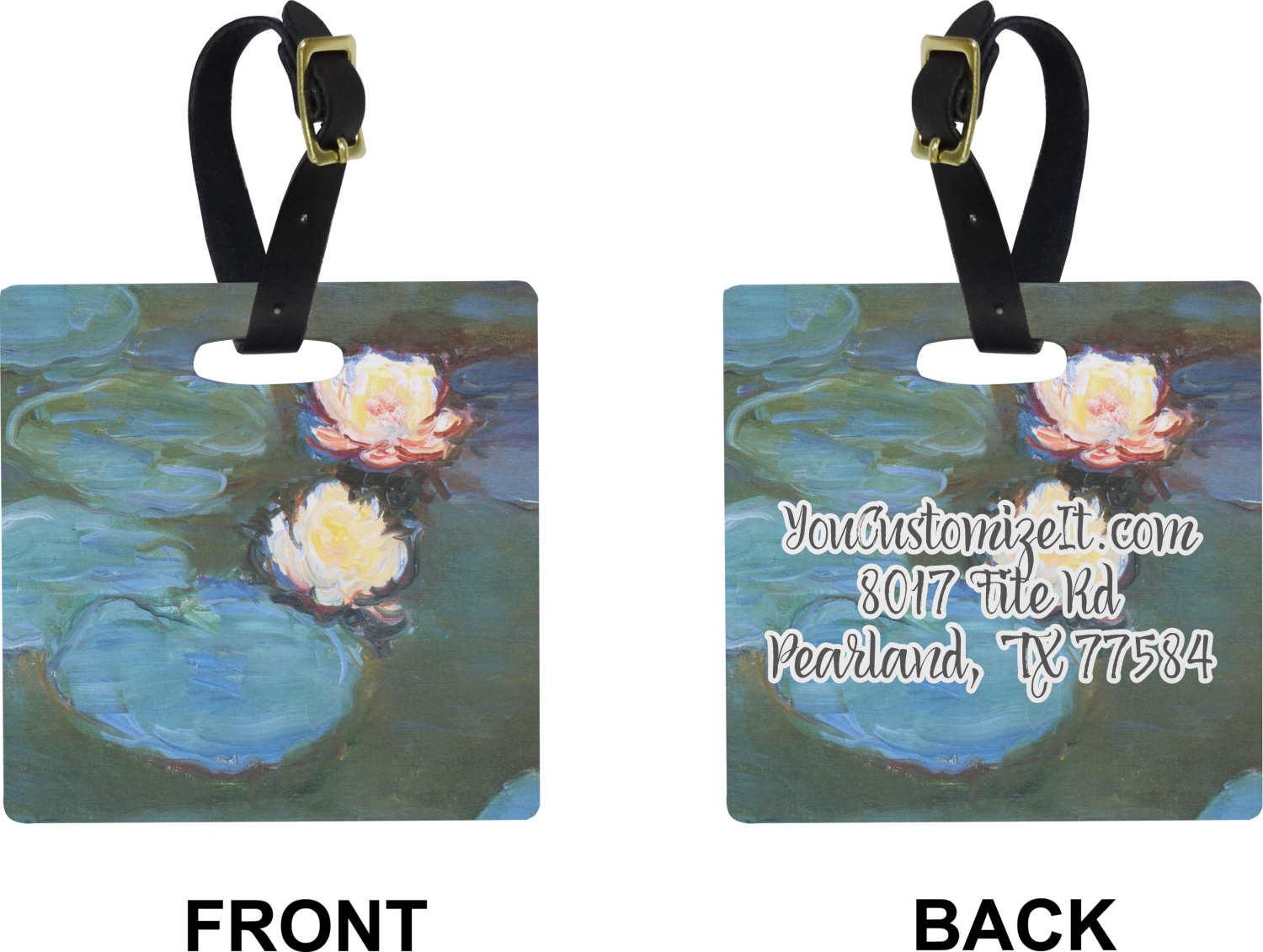 These personalized bag tags are sold in a variety of shapes, so that you may find the product that meets your vision exactly. We sell a round luggage tag, which measures at approximately 4" x 4". Our square luggage tag is about 3.5" x 3.5", while our rectangular version is 2.75" x 4 ".